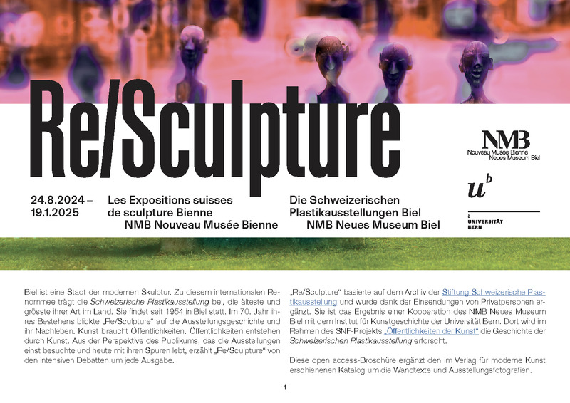 Die open access-Broschüre entstand im Nachgang zur Ausstellung "Re/Sculpture. Die Schweizerischen Plastikausstellungen Biel" im NMB Neues Museum Biel. Sie ergänzt den im Verlag für moderne Kunst erschienenen Katalog um die Wandtexte und Ausstellungsfotografien. Die Texte sind interaktiv angereichert mit Dokumenten aus dem Citizen Archive publics-arts.ch.