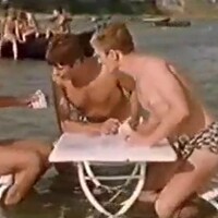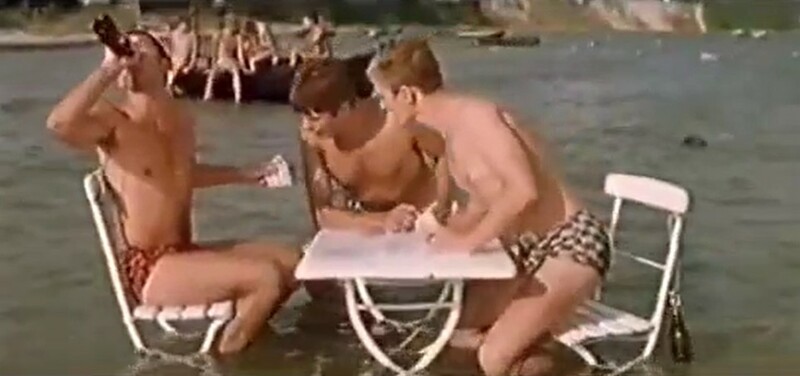 - Jungs in Badehosen am/im See: Bier trinkend und Kartenspiel spielend.