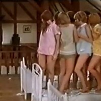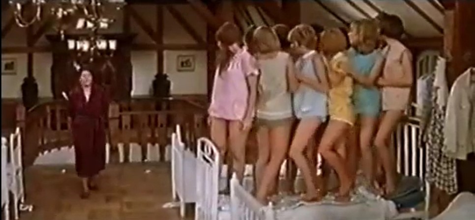 - Mädels retten sich vor Mäusen im Schlafsaal und flüchten auf ein Bett.