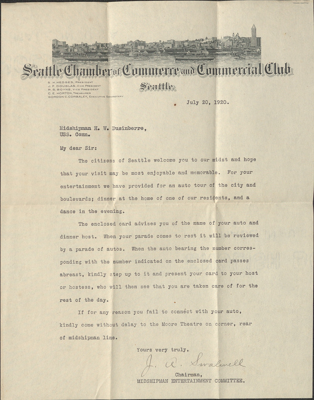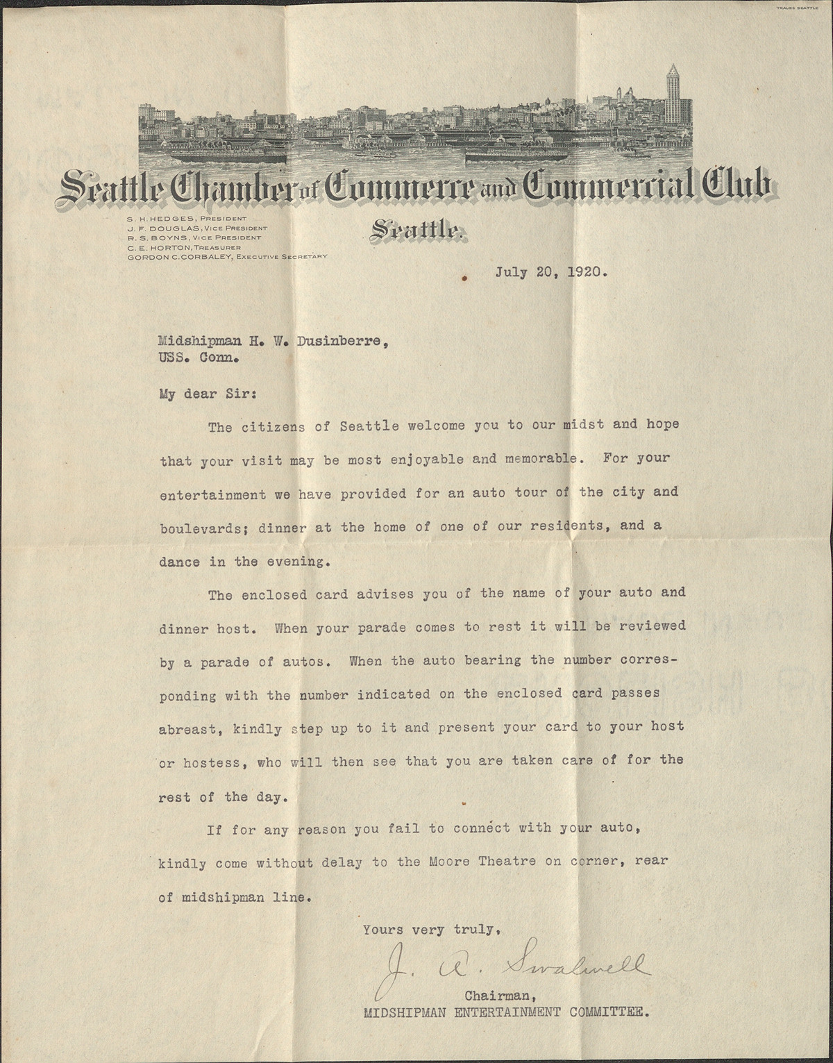 Invitation for Herny Warner Dusinberre to Seattle by the Midchipman Entertainment Committee