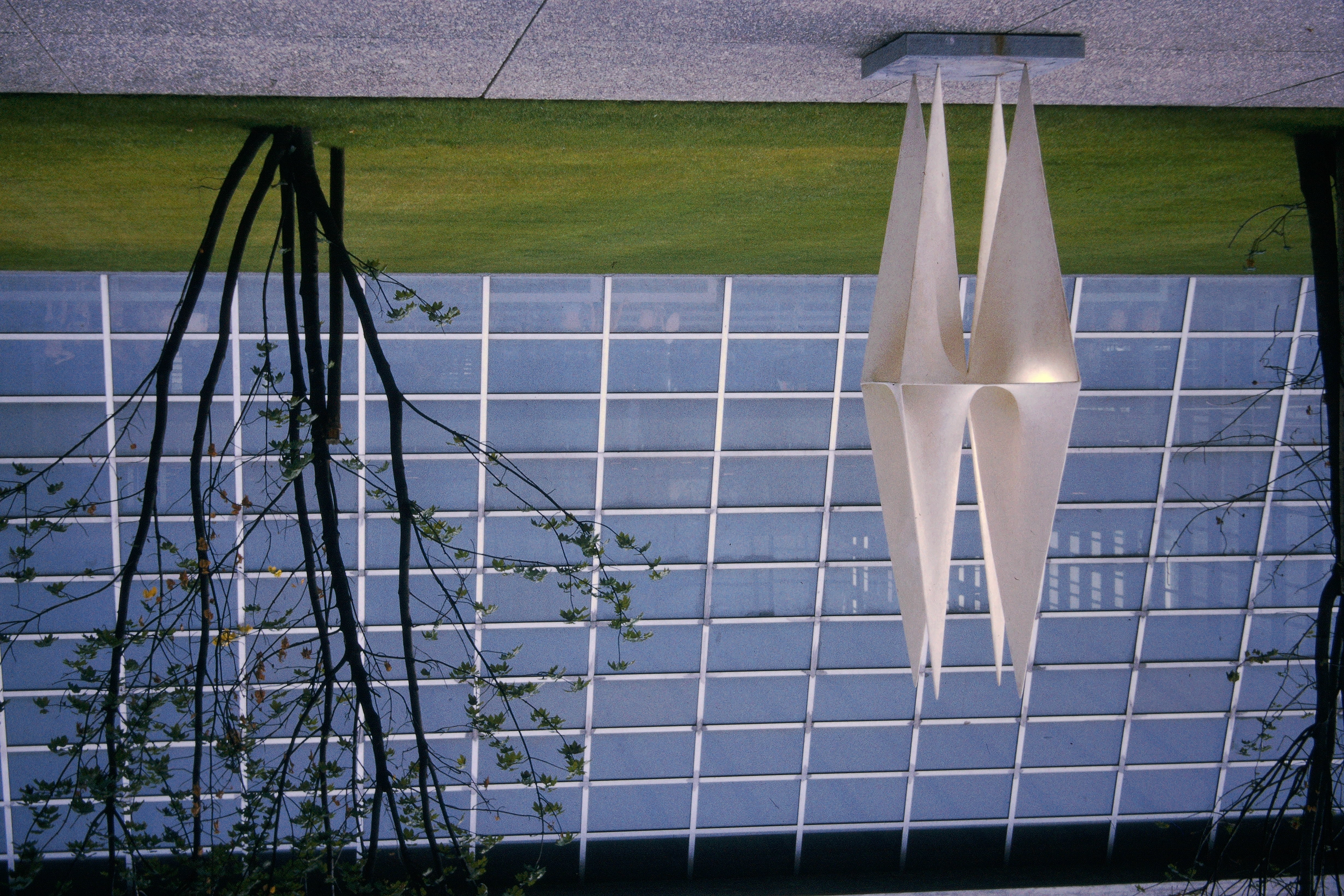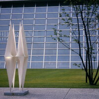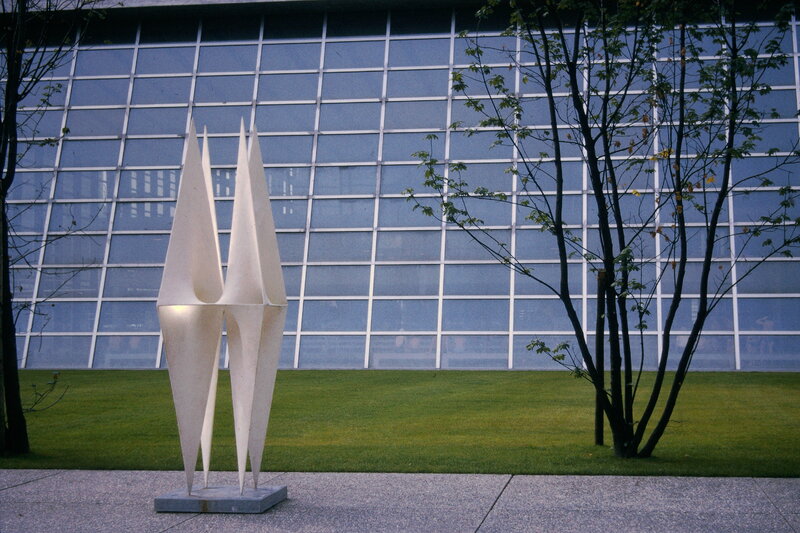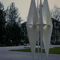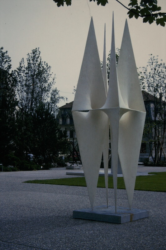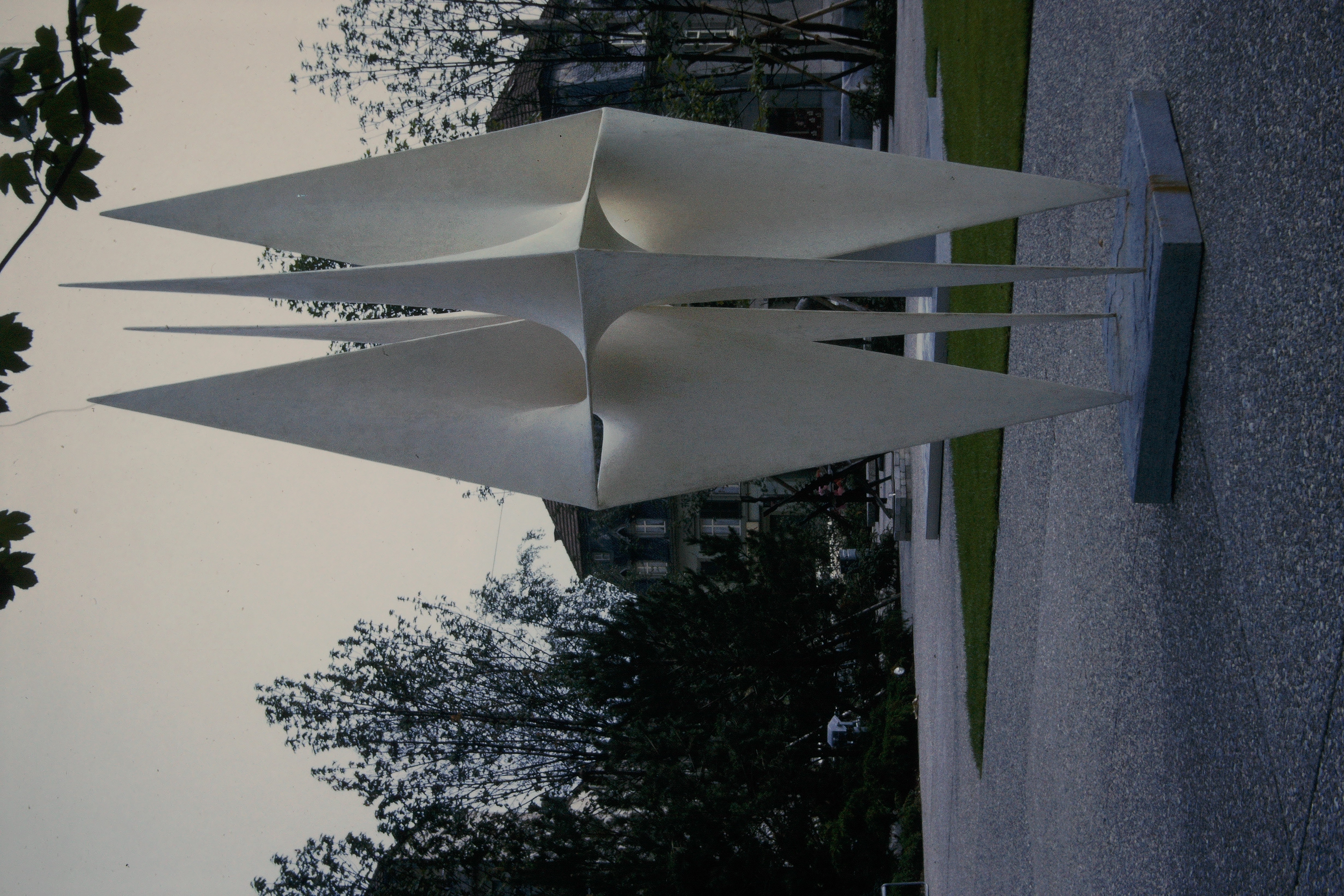 - Die vor dem Kongresshaus aufgestellte Skulptur aus Eisen und Polyester stand vor dem Kongresshaus. Im Hintergrund befindet sich das Hallenschwimmbad - die Umrisse von Schwimmerinnen sind hinter der Glasfassade im Hintergrund sichtbar.
