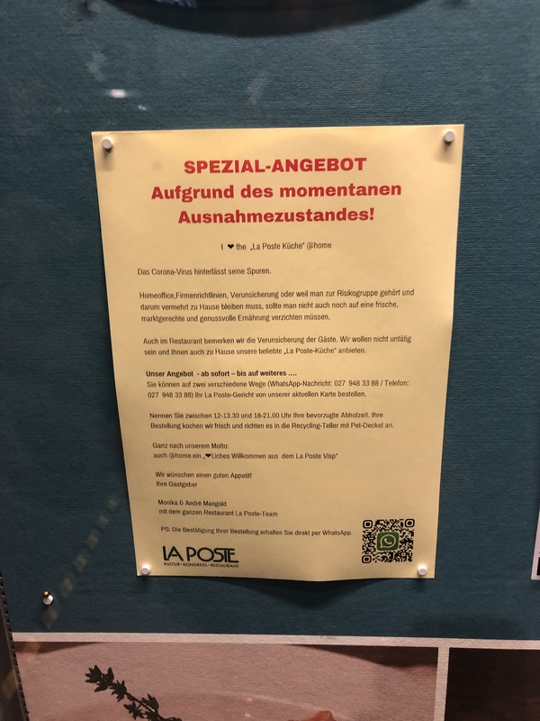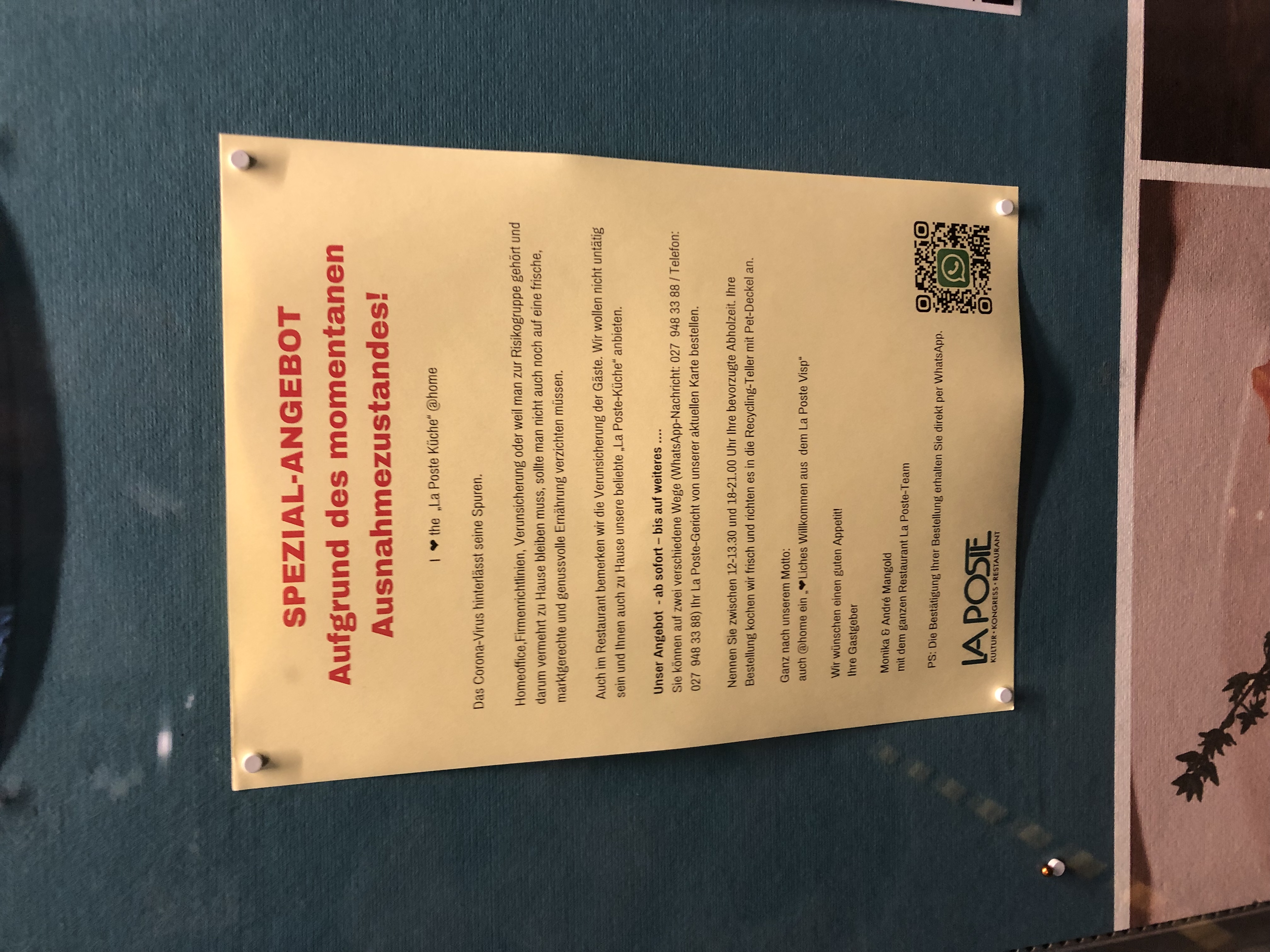 - Ich habe gar nicht realisiert, wie sehr es mir gefehlt hat, hie und da in einem Restaurant zu essen. Trotz angepasster Karte haben ich und meine Freunde im „La Poste“ in Visp super gegessen und den Abend sehr genossen!