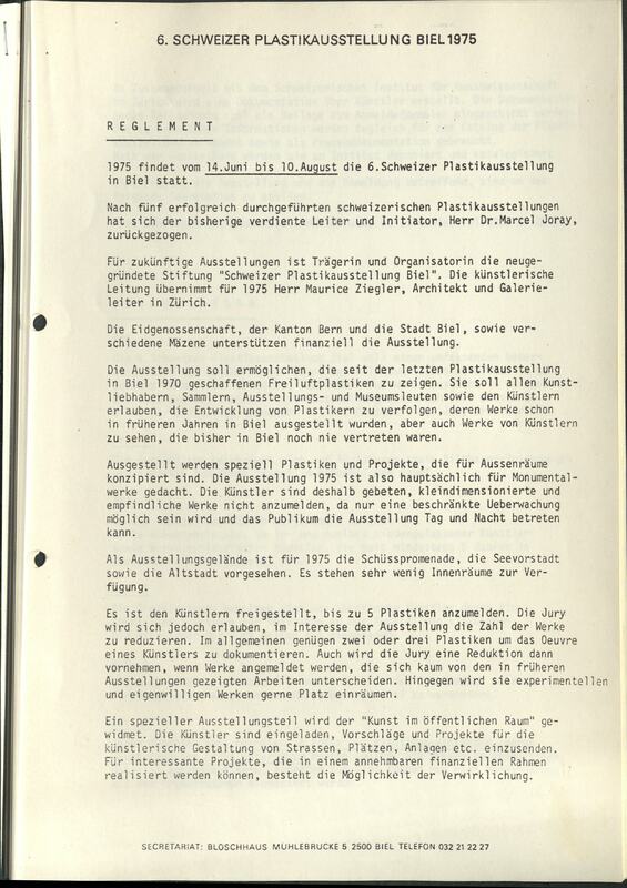 - Das Reglement legt die Teilnahmebestimmungen dar und weist auf konzeptuelle Entscheidungen der Veranstalter hin. Unter anderem wird um Einsendung von "experimentellen und eigenwilligen Werken" gebeten. Ein Teil der Ausstellung war der Gestaltung öffentlicher Plätze, Anlagen, Strassen gewidmet. Auch hierzu ruft die Stiftung zur Einsendung von Projektvorschlägen auf.