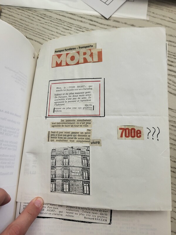Collage mit Negativstimmen zur Installation "VOIR MORT" von Rémy Zaugg (1991)