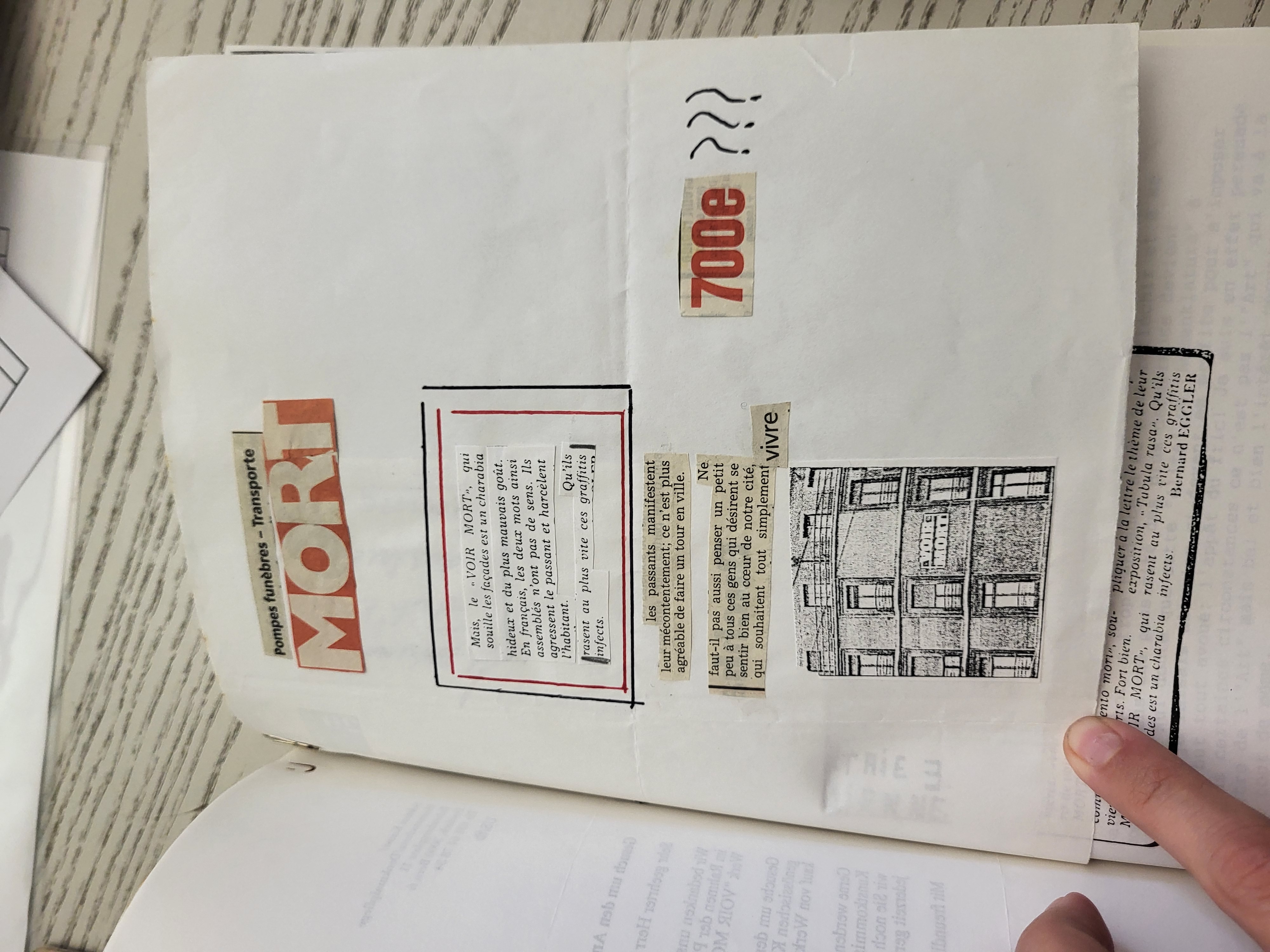 - Diese Collage ist ein Protestbrief gegen Rémy Zauggs Installation "VOIR MORT". An drei Häusserfassaden waren die beiden Wörter in leuchtenden Neonröhren angebracht - das missfiel einigen Bewohner:innen. Die 700 deutet auf den besonderen Anlass der Schweizerischen Plastikausstellung hin: Er fiel zusammen mit dem Jubiläumsjahr zu 700 Jahren Eidgenossenschaft.