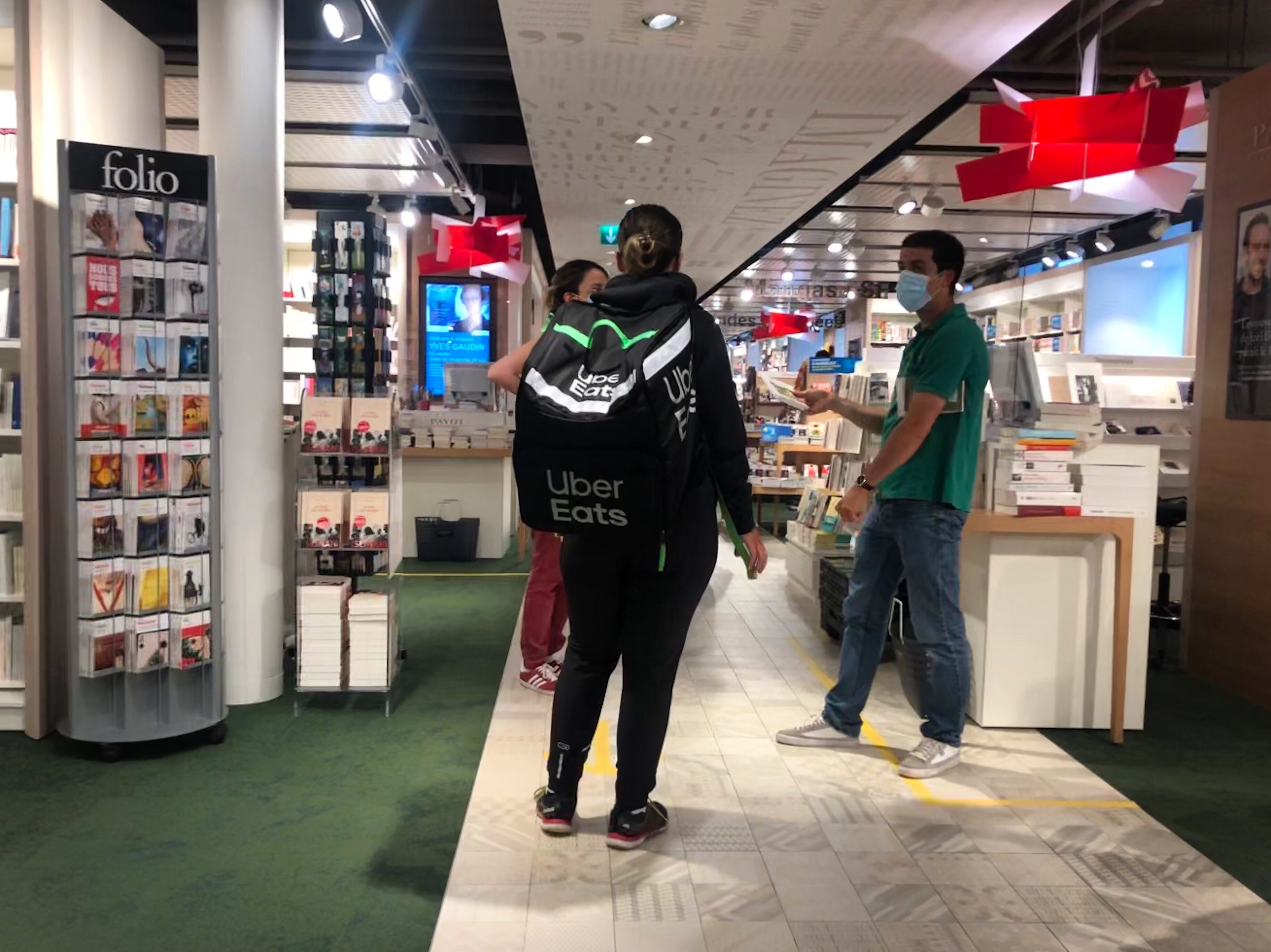 - Les vendeurs d'une libraire réceptionnent une livreuse. Vient-elle livrer un repas ou acheter un livre?