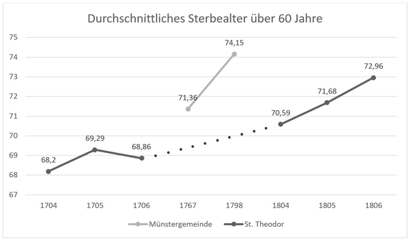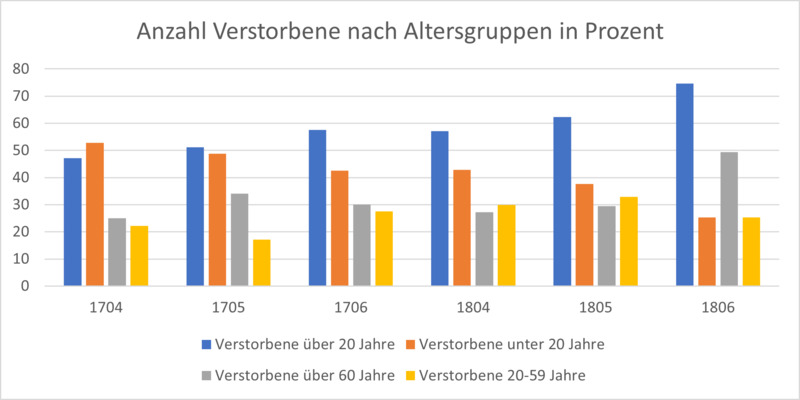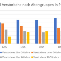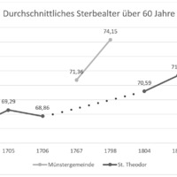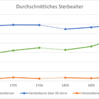 - In diesem Kirchenarchiv sind die Beerdigungen in der Münstergemeinde von 1711-1799 unterteilt. Für diese Untersuchung relevant sind die Jahre 1713, 1727, 1767 und 1798. Unterteilt nach Kirchen und Altersgruppen zeigt das Kirchenregister auf, wer beerdigt wurde und in den meisten Fällen, welches Alter sie erreicht haben.