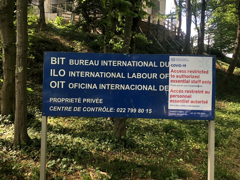 - Une affiche collée sur le panneau d'entrée du Bureau international du travail annonce que l'accès est restreint au "personnel essentiel autorisé" .