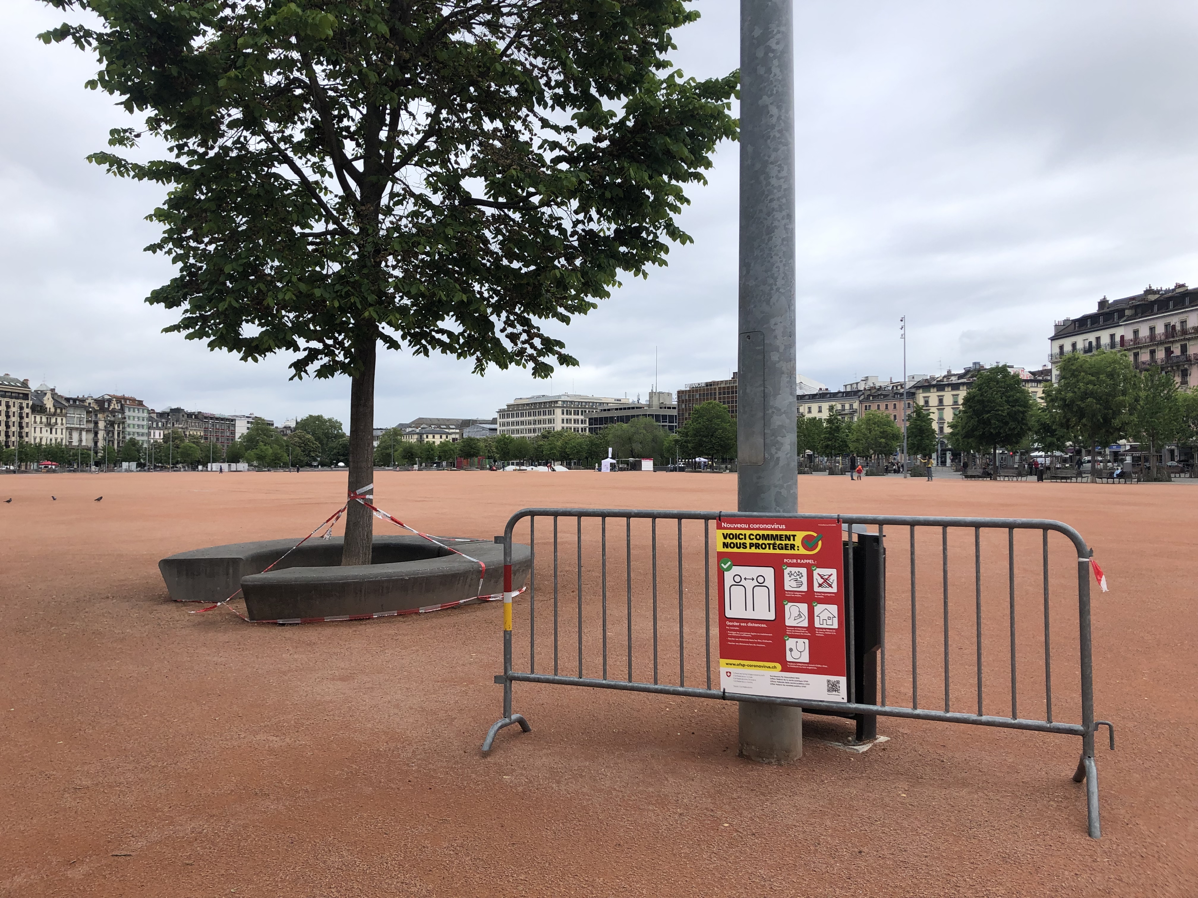 - Une barrière a été placée devant un arbre entouré de bancs en pierre donc l'accès est barré par une banderole de la police municipale.