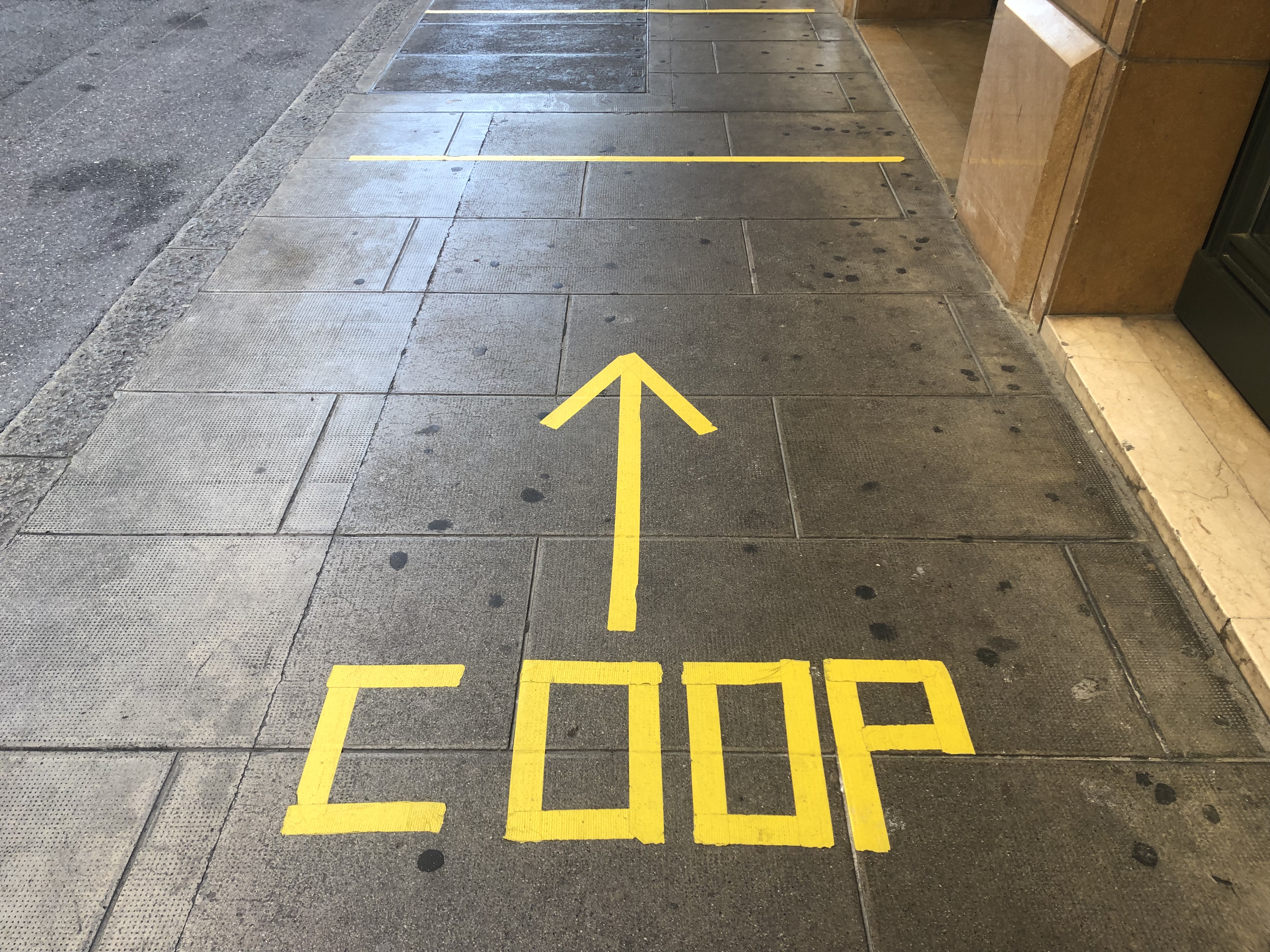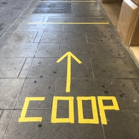 - Des indications collées au sol indique la direction pour faire la queue vers un supermarché.