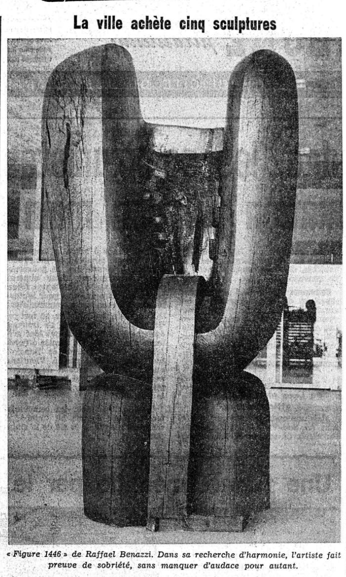 - Ein Zeitungsbeitrag des "Journal du Jura" zum Ankauf von "Figur 1446" von Raffael Benazzi durch die Stadt Biel. Ausgestellt war die Eichenholzskulptur an der fünften Schweizerischen Plastikausstellung.