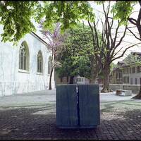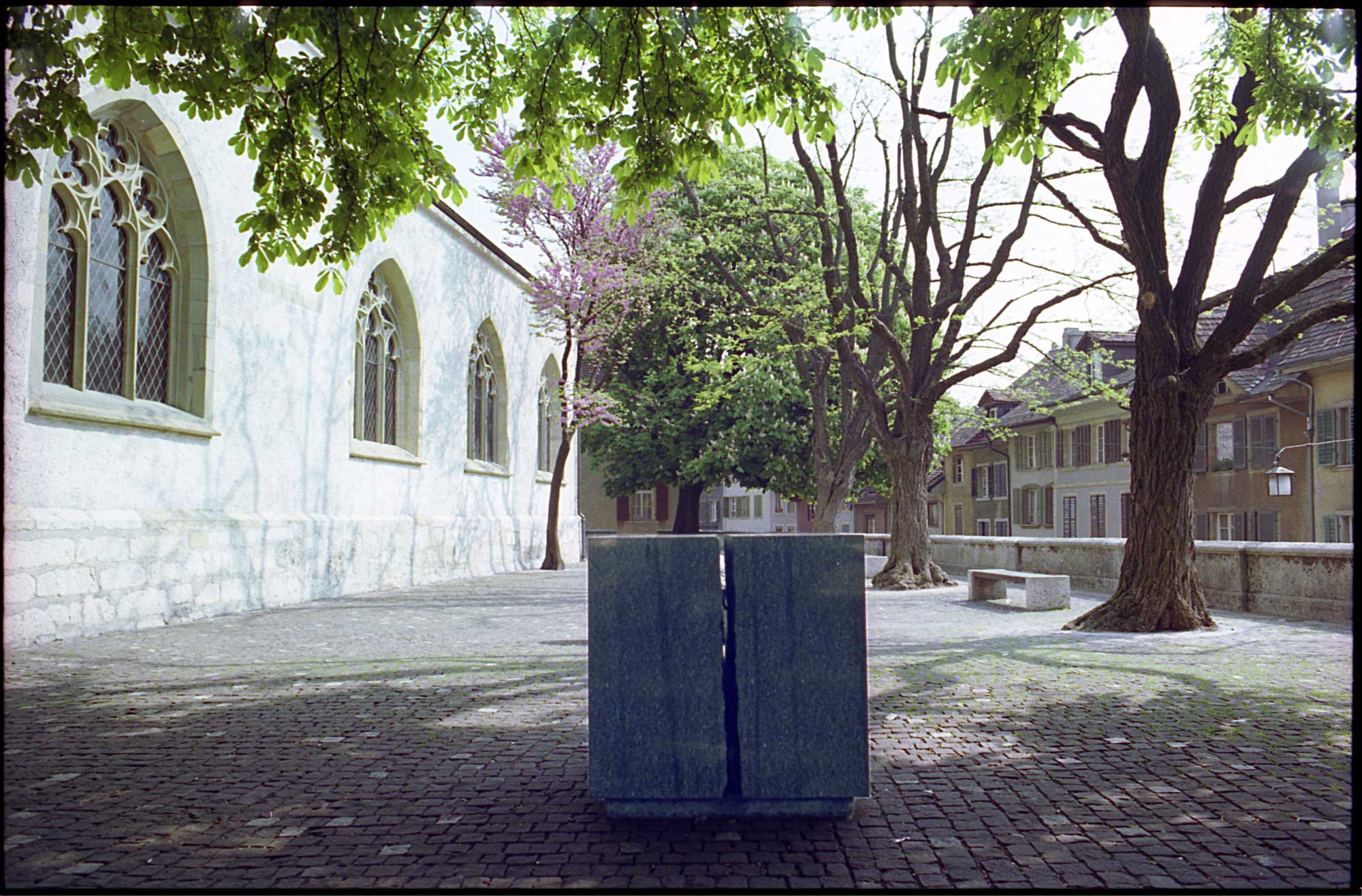 - Le cube de granit massif se trouve encore aujourd'hui à l'endroit où il a été installé pour la sixième ESS : sur la terrasse de l'église de la ville de Bienne.