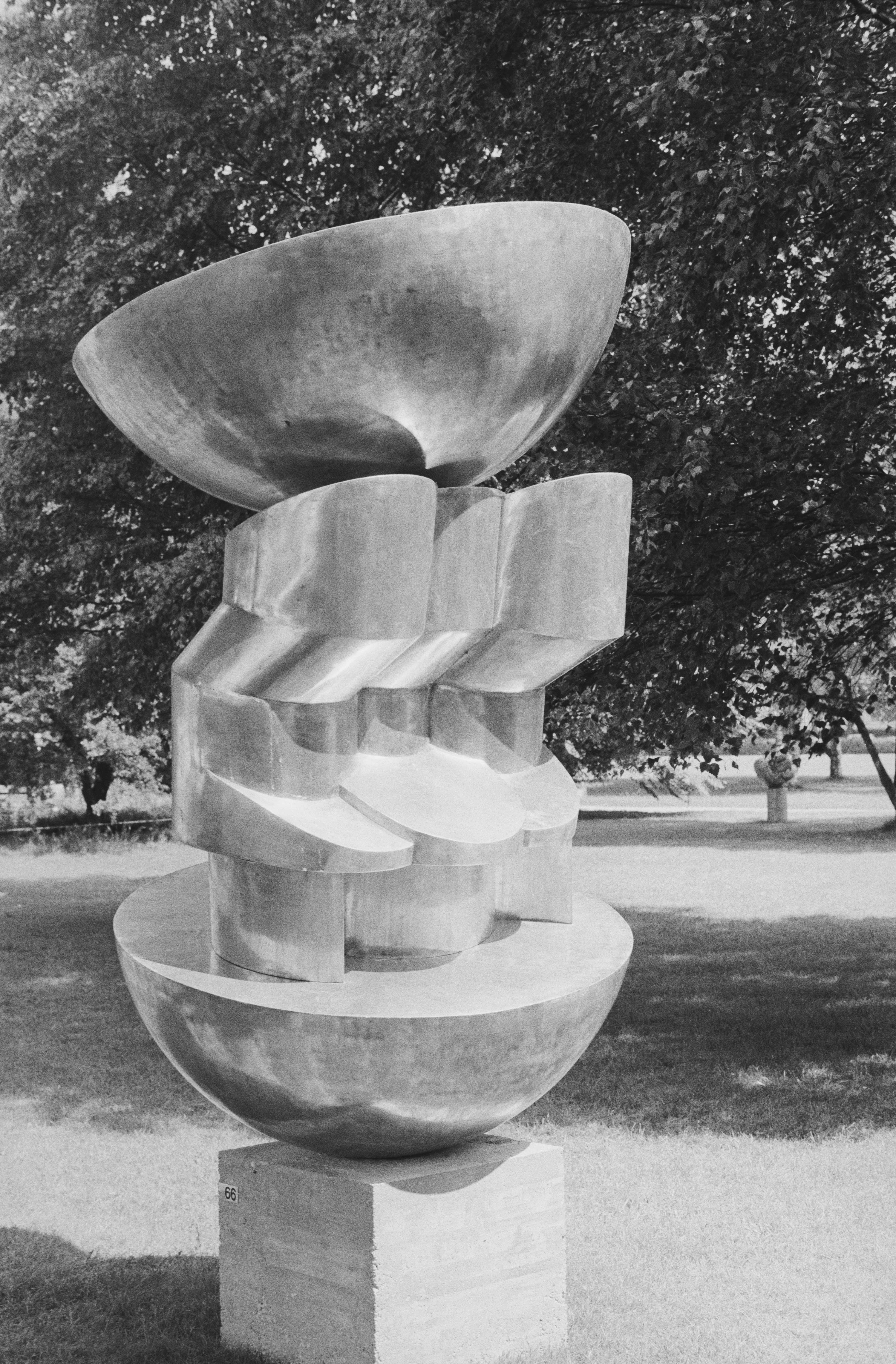 - Die Fotografie zeigt die Ansicht während der 5. Schweizerischen Plastikausstellung, wo die Aluminiumskulptur an der Seepromenade ausgestellt war. Sie steht heute vor einem Privathaus in Rubigen.