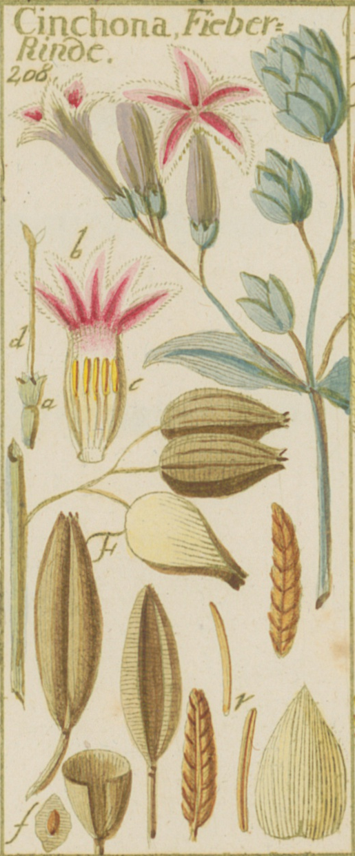 Fieberrinde (Cinchona officinalis), aus: Johannes Gessner: Tabulae phytographicae. Zürich 1759, Tafel 13.