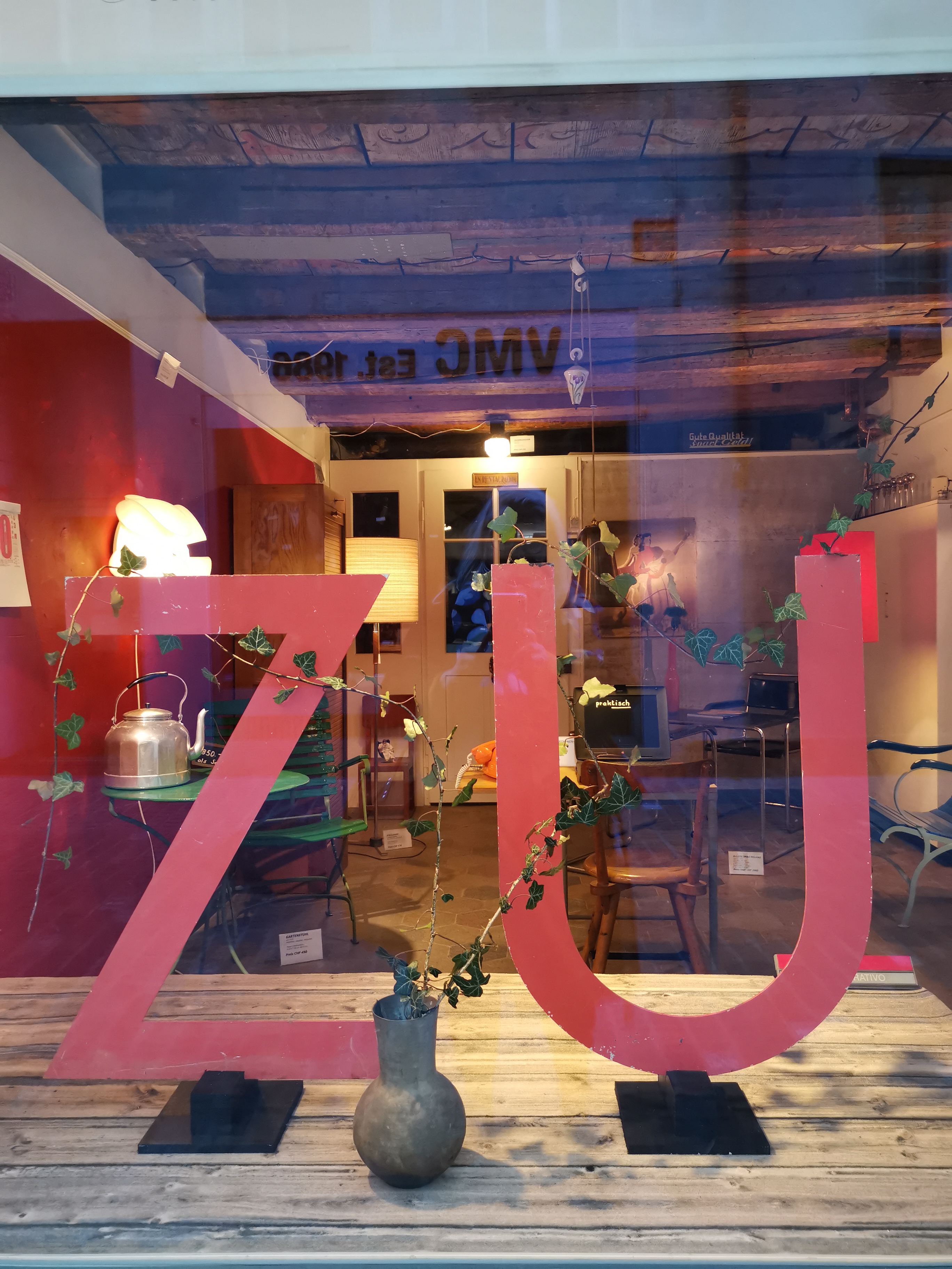 Massimo Biondi hat auch während dem Lockdown, als sein Vintage Möbel Geschäft zu war, wöchentliche seine Schaufenster geschmückt