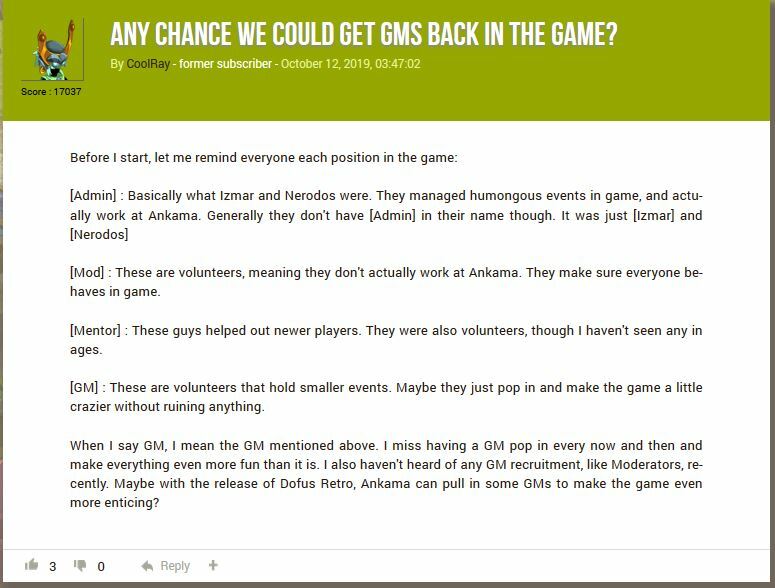 When I say GM, I mean the GM mentioned above. I miss having a GM pop in every now and then and make everything even more fun than it is. I also haven't heard of any GM recruitment, like Moderators, recently. Maybe with the release of Dofus Retro, Ankama can pull in some GMs to make the game even more enticing?