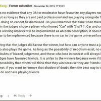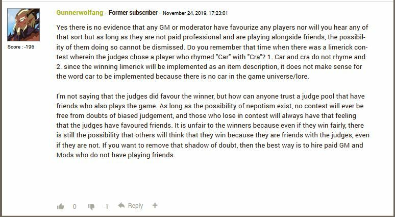 Yes there is no evidence that any GM or moderator have favourize any players nor will you hear any of that sort but as long as they are not paid professional and are playing alongside friends, the possibility of them doing so cannot be dismissed. Do you remember that time when there was a limerick contest wherein the judges chose a player who rhymed "Car" with "Cra"? 1. Car and cra do not rhyme and 2. since the winning limerick will be implemented as an item description, it does not make sense for the word car to be implemented because there is no car in the game universe/lore.