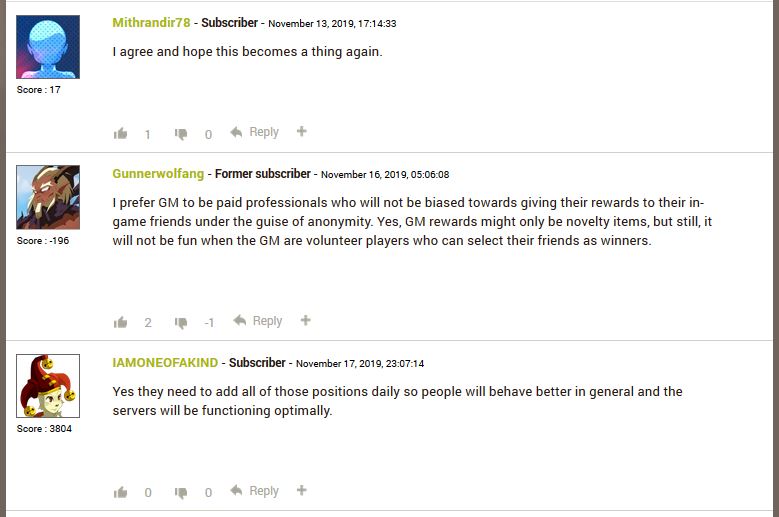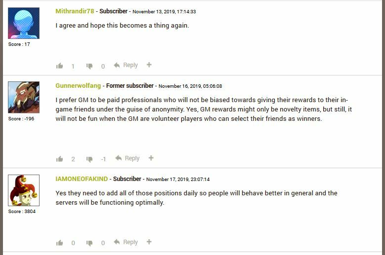 I prefer GM to be paid professionals who will not be biased towards giving their rewards to their in-game friends under the guise of anonymity. Yes, GM rewards might only be novelty items, but still, it will not be fun when the GM are volunteer players who can select their friends as winners.