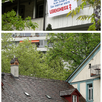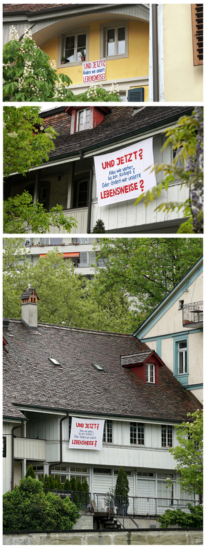 Mit zwei Transparenten (Klösterlistutz 18, mein Atelier / Altenbergstrasse 16, meine Wohnung) wollte ich die mir zentral erscheinende Frage für eine gemeinsame Zukunft in den öffentlichen Raum stellen - und damit auch ein Statement abgeben: