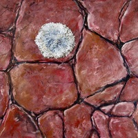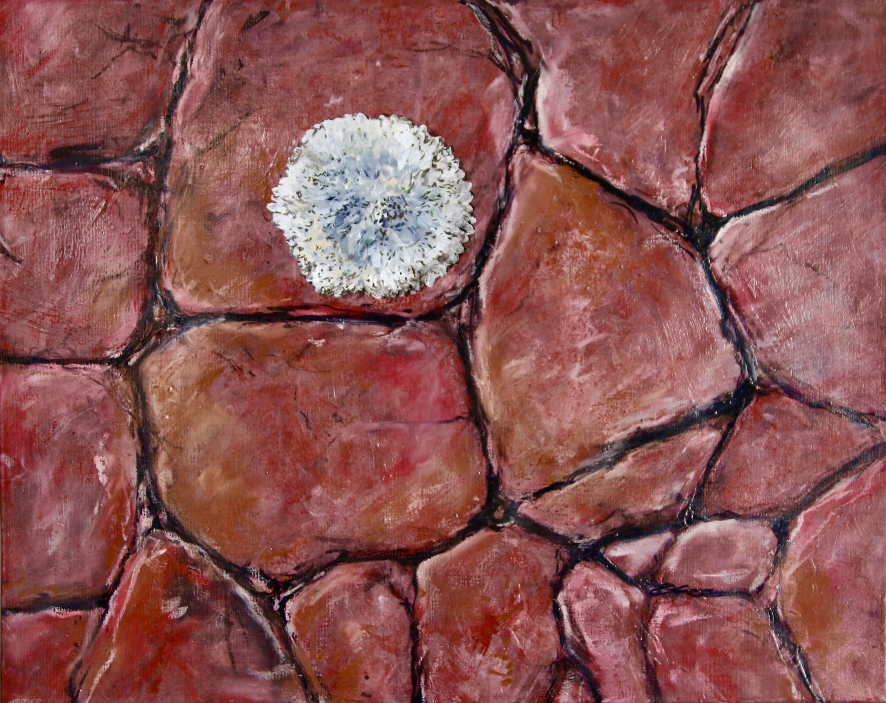 - Eigentlich wollte ich im April 2020 mit einem Malkurs an den Salagou in Frankreich, was durch Corona verhindert wurde. Meine Malschule wurde geschlossen. Ich habe dann zuhause begonnen, aus Frust und Langeweile Bilder von verhinderten Reisezielen nach Fotos zu malen. Auf das unfertige Bild vom letzten Kurs mit dem typischen Steinboden der Salagou-Region, habe ich dann die "Corona" einer typischen Flechte der Region gemalt. Die langsam wachsende Flechte steht als Kontrapunkt zum weltweit rasant verbreitenden Virus, der die ganze Erde in den Bann zieht und nachhaltig prägen wird.