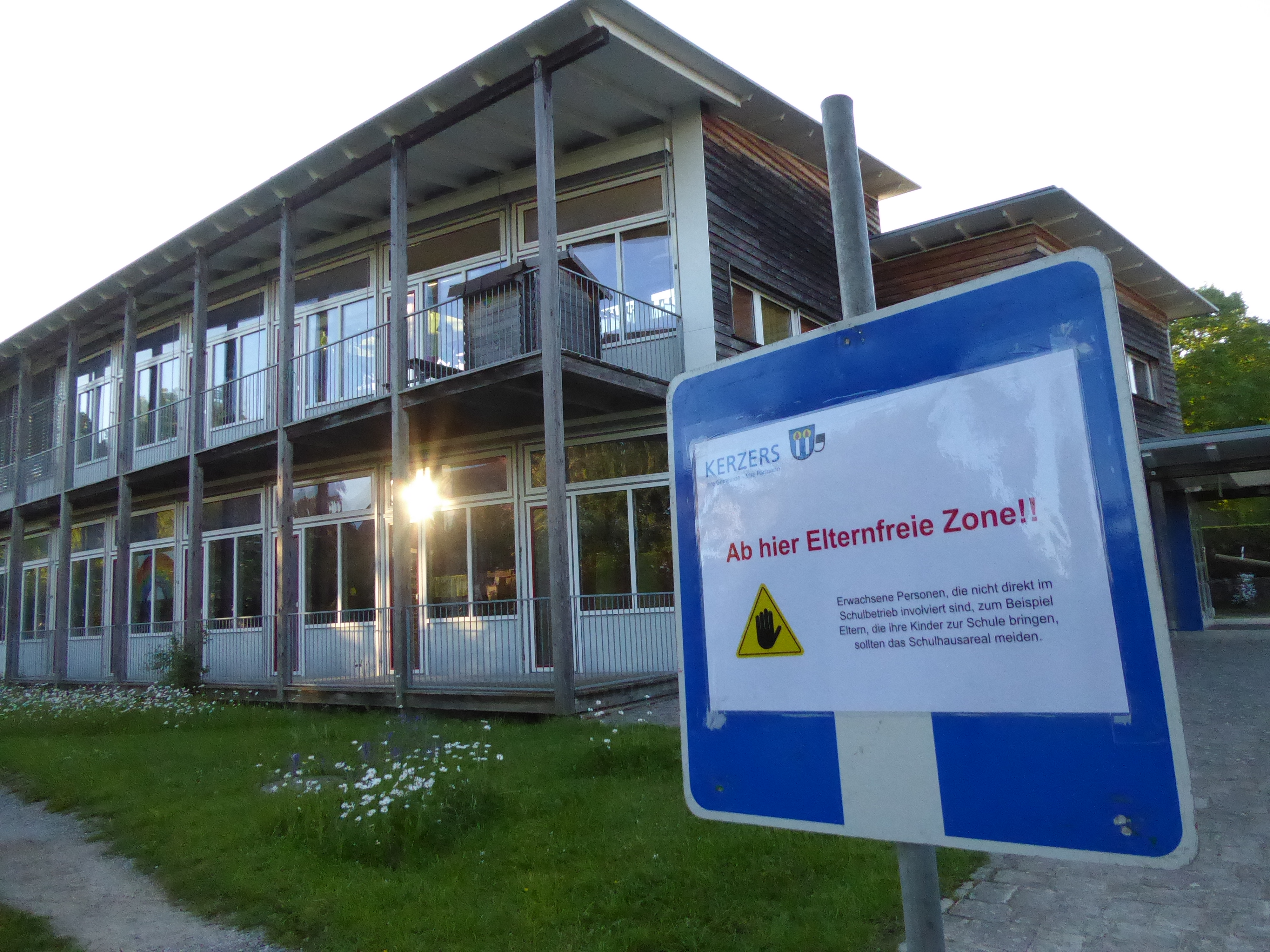 - Auf einer Morgenwanderung entdeckt beim Zugang zu einer Volksschule: ein Schild mit Hinweis „Ab hier Elternfreie Zone!!“