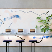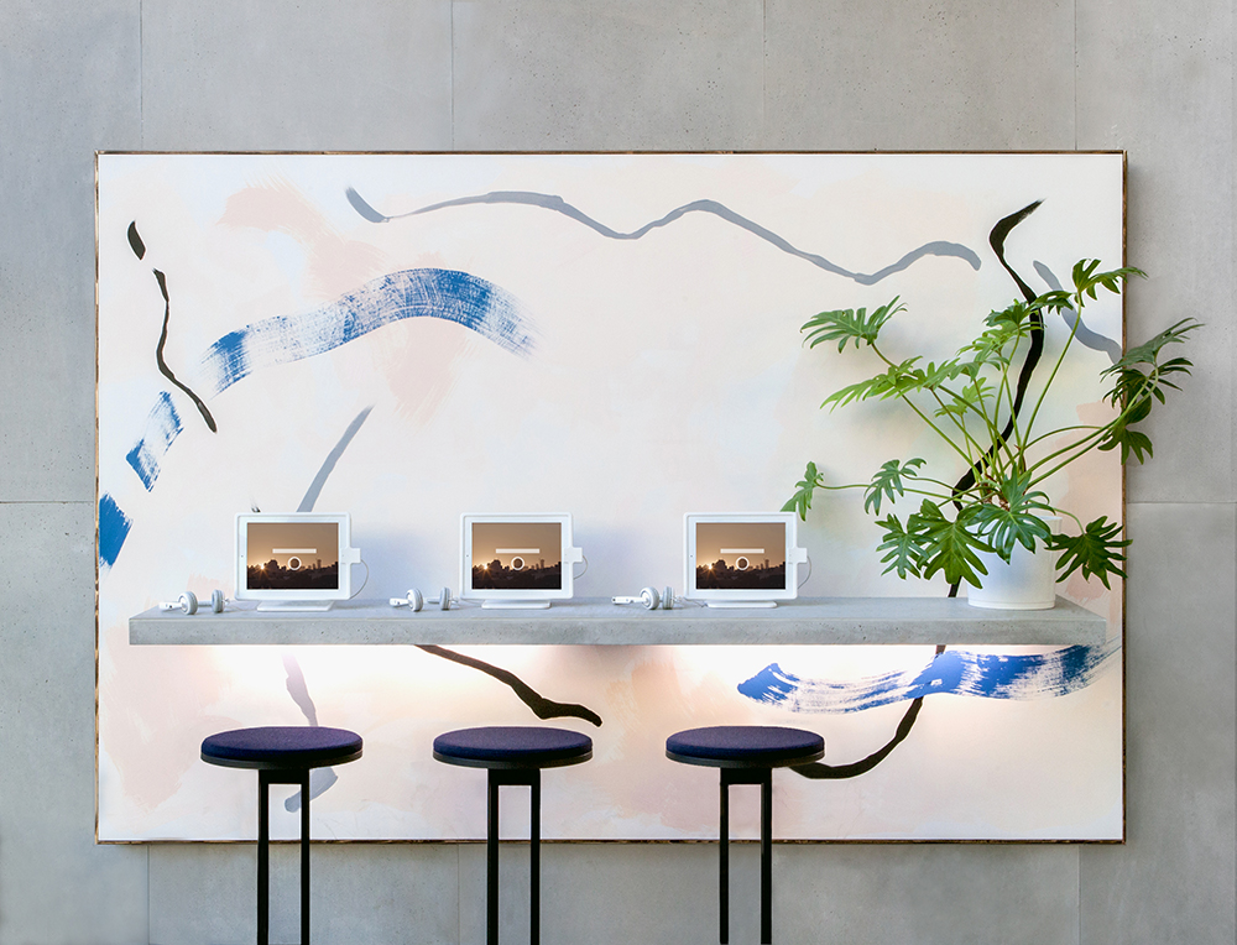 - Christopher Kulendran Thomas und Annika Kuhlman, Detailansicht, New Eelam, 2016, Acryl auf Leinwand, Betonablage, LED, Planze, New Eelam Video (HD, 14:06min), ATLAS Barhocker von New Tendency, Ausstellungsansicht an der 9. Berlin Biennale 2016, Akademie der Künste Berlin, Foto: Laura Fiorio, Quelle: newgalerie.com
