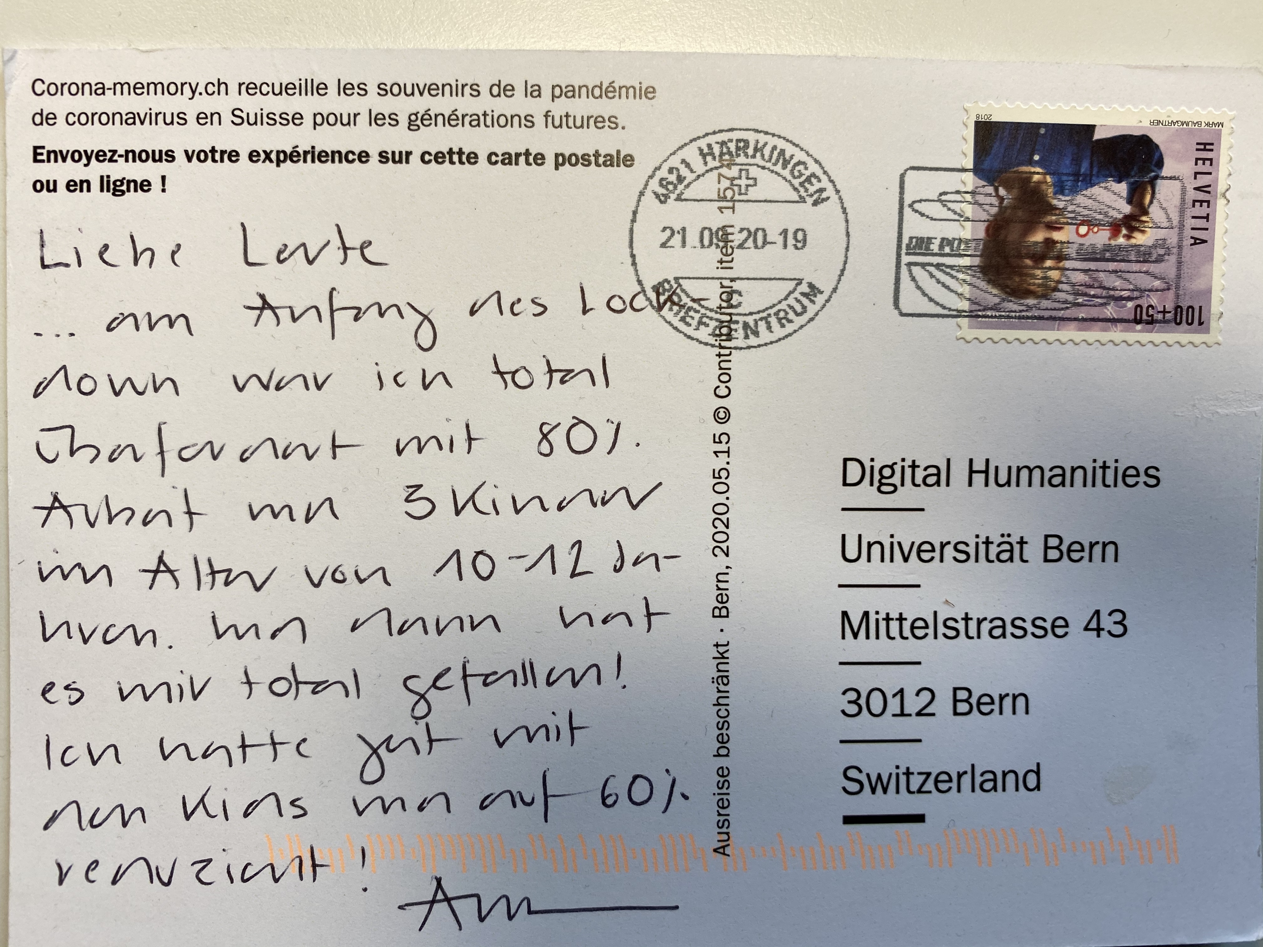 ... am Anfang des Lockdown war ich total überfordert mit 80% Arbeit und drei Kindern im Alter von 10 bis 12 Jahren. Und dann hat es mir total gefallen! Ich hatte Zeit mit den Kids und auf 60% reduziert. - Datum