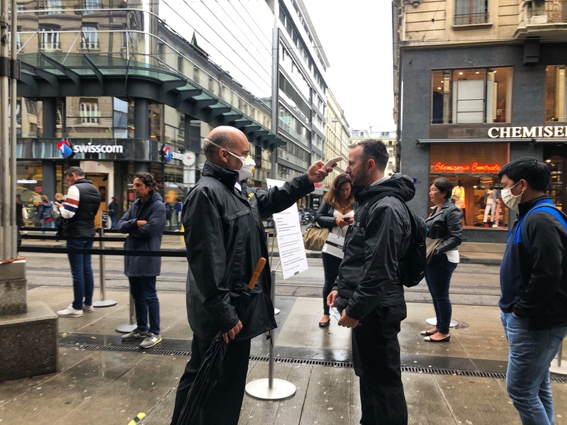 - Un magasin à Genève prend la température des gens qui font la queue pour y rentrer.