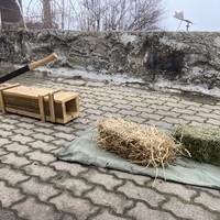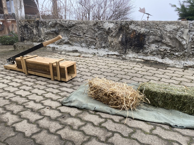 Hier ein Foto von der Presse und von den Kleinballen, die man damit machen kann. Florian mäht das Gras mit der Sense, dörrt es an der Sonne l, madet Wälmli und presst stundenlang seine Ballen. Eine super Idee und eine super „Corona Entwicklung“. Ichh habe mega Freude! - Datum