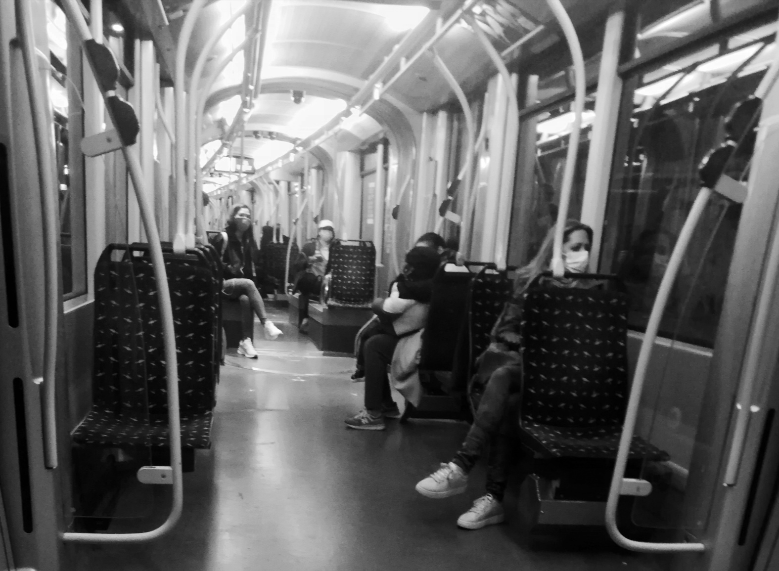 Trams vides et gens masqués.