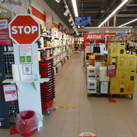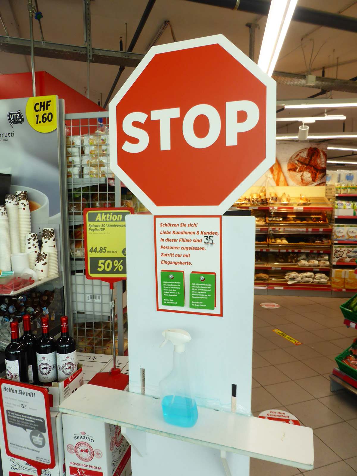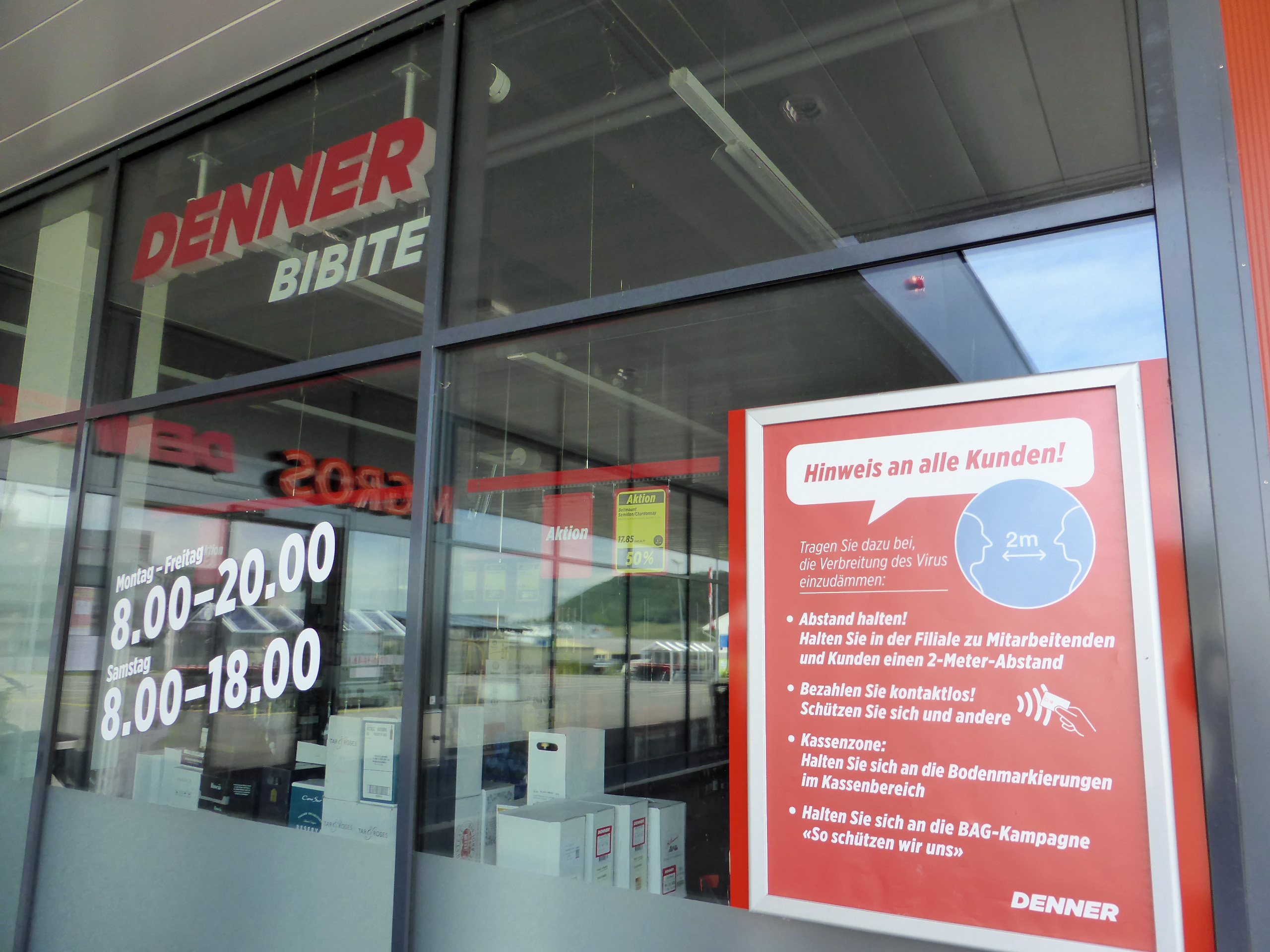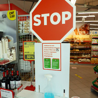 - Desinfektionsmittel, Bodenmarkierungen und Hinweisschilder im Detailhänder Denner