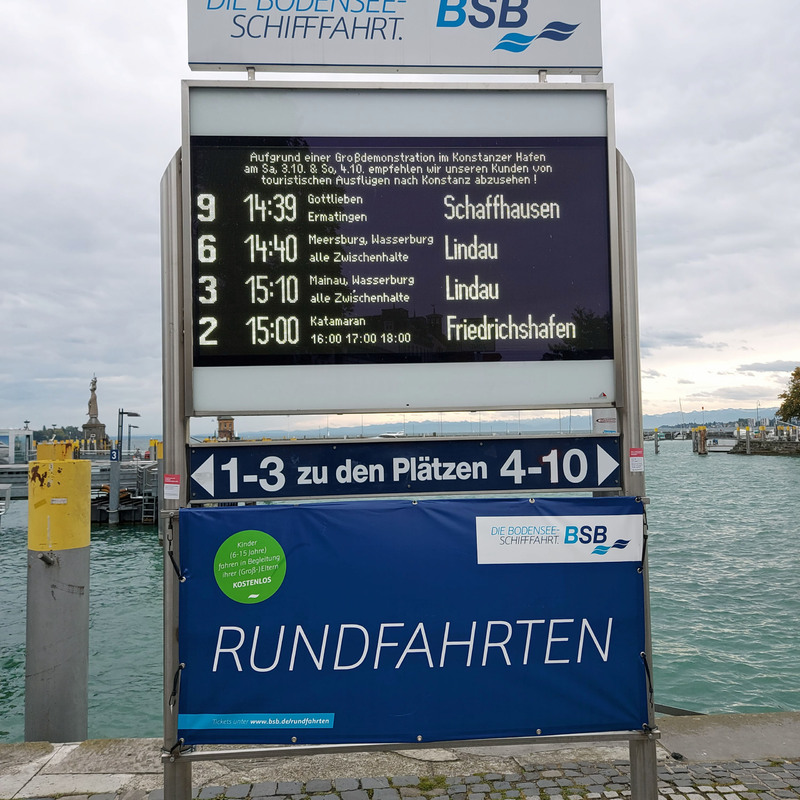 - Die Bodensee-Schiffahrt warnt an ihrer digitalen Fahrplantafel in Konstanz vor dem touristischen Besuch der Stadt wegen der bevorstehenden Anti-Corona-Demonstration und dem damit zusammenhängenden Aufmarsch einer grossen Anzahl von Personen.