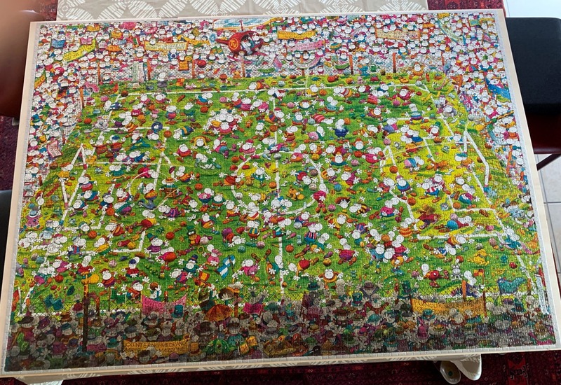 - Seit Jahren stand die Schachtel mit diesem Puzzle - 4000 Teile! - in einem Regal. Nun haben wir es hrvorgeholt und wurden fast süchtig! Allein das Aussortieren der kleinen Teile war eine Herausforderung: Rand, dunkle und grüne Teile, Augen, Füsse, Nasen... Ca. drei Wochen haben wir gebraucht, um das Bild fertigzustellen, die Zeit verging im Nu!