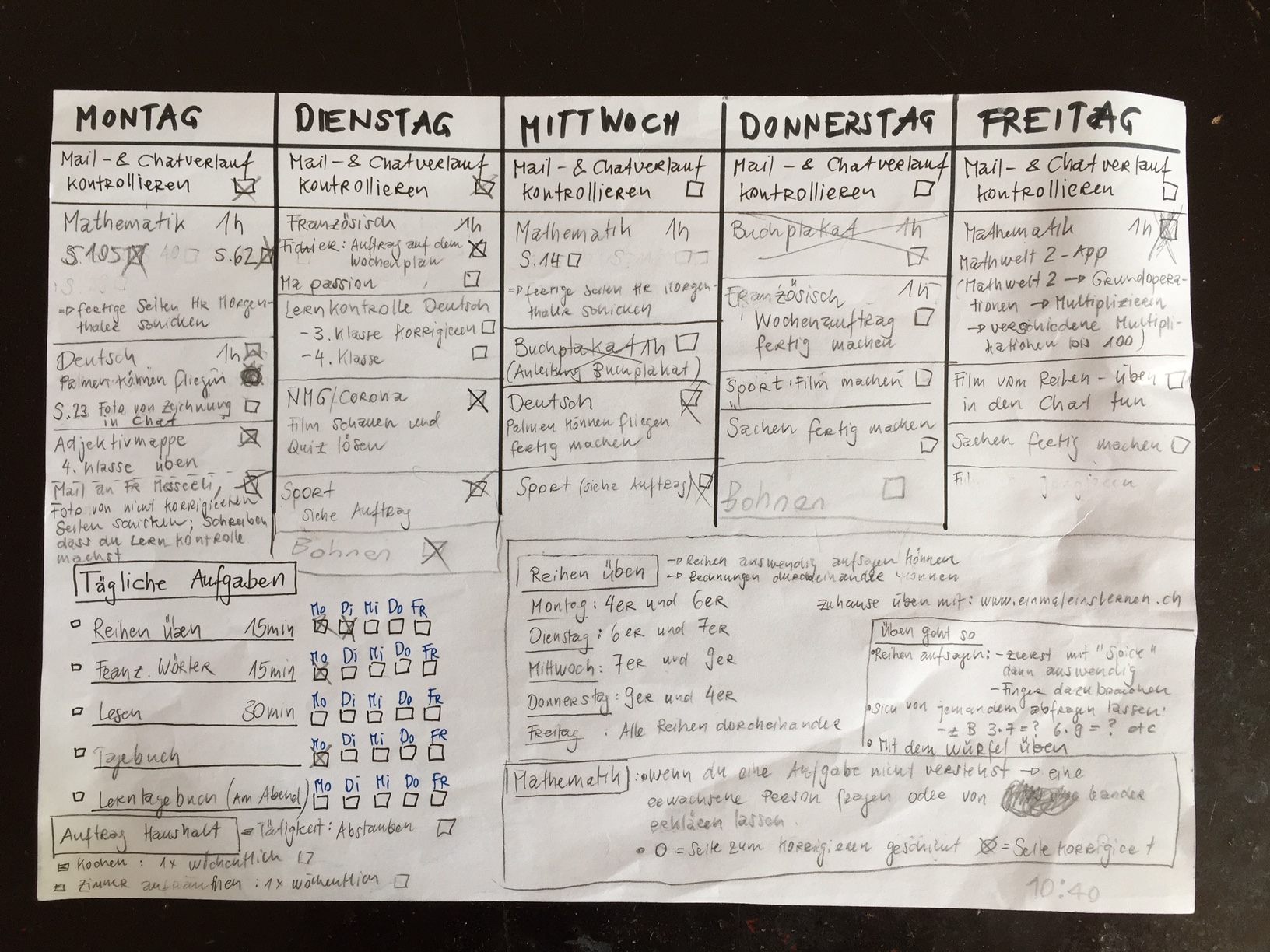 - Die Aufträge von der Schule für den Fernunterricht waren anfangs total unübersichtlich und für meinen Sohn, der in der vierten Klasse ist, eine totale Überforderung. Ich habe versucht, eine Übersicht und mehr Struktur in die Wochenaufträge zu bringen. Ebenfalls eine totale Überforderung...