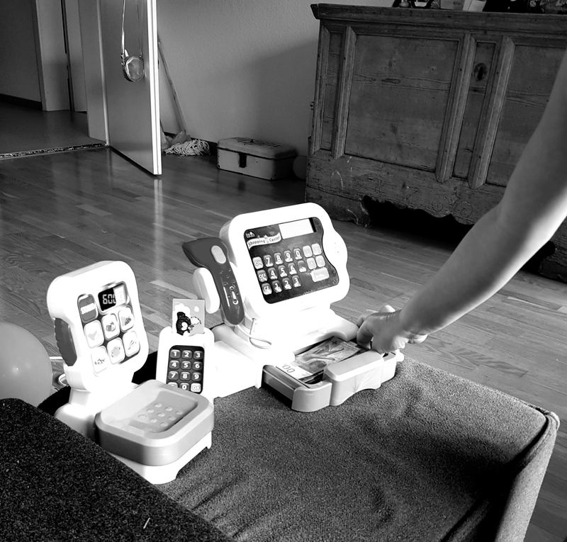 Papi und Maman sind mit Töchterchen (4) im Home Office. Die ersten Tage sind spannend: 4 Notebooks, Headsets, Videokonferenzen. "Computerle" ist super!" meint Käferli. Die eigene Spielzeugeinkaufskasse wird prompt zum Bildschirm umfunktioniert, "allo, Roger! Hörst du mich?" Es kommt aber Tag 4, Tag 5, Tag 6 ... der permanente Zukunftstag hat die Begeisterung rasch abgelöscht. Computer ist doof, Telefonate lästig.... - annotates