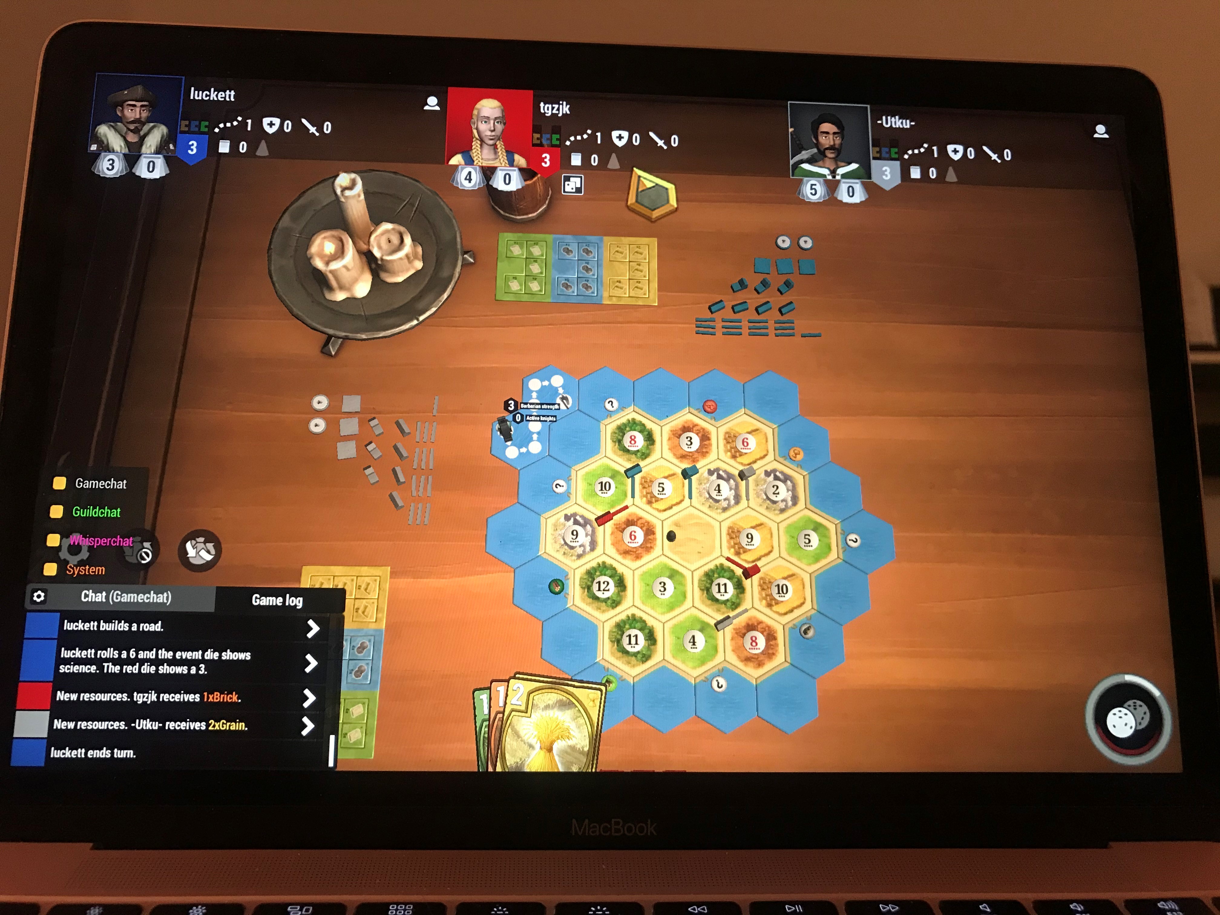 Mir widerstrebte es zu Beginn sehr, dieses lebendige Spiel online zu spielen. Aber mit der Zeit hatte ich genauso viel Spass und gute Gespräche, wie wenn wir immer noch am grossen Tisch bei mir im Wohnzimmer sässen. Statt im realen Austausch, verständigten wir uns über What's App und hatten so fast mehr Zeit für Gespräche, da der PC Aufgaben wie die Punktestatistik oder das Austeilen von Rohstoffkarten erleichterte. Was sonst die meiste Zeit in Anspruch nimmt, war mit einem Klick erledigt.