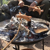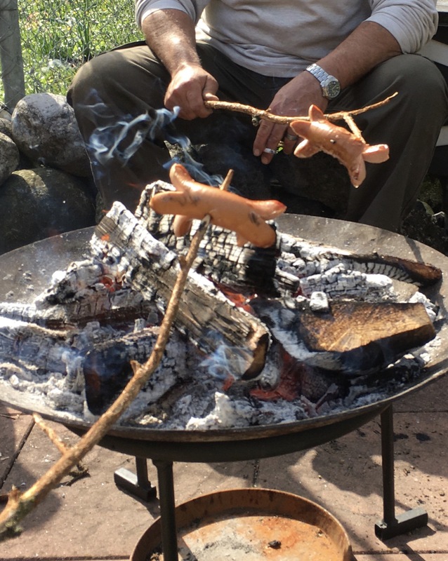 - Cervelat am Holzstecken über der Feuerschale zu Hause im Garten brätle😊
