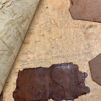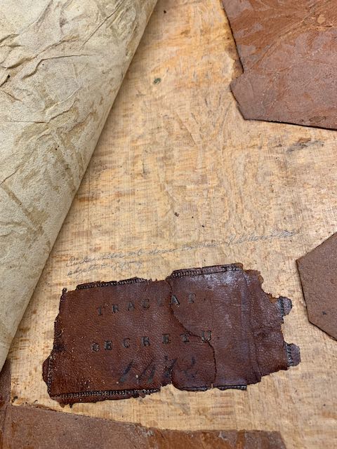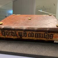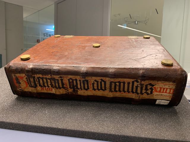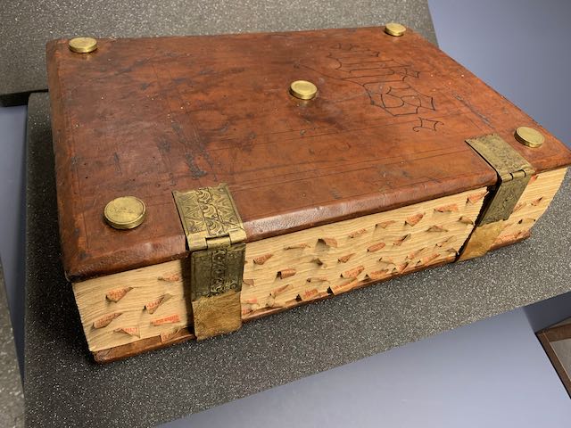 - dahinter in roter Tinte nochmals eine rote Ziffer, vielleicht nachträglich angebracht, denn ein durch Lindt abgelöstes Leder-Titelschild vom "zweiten Rückenfeld" befindet sich heute im hinteren Deckel – es hätte die Zahl XIII verdeckt