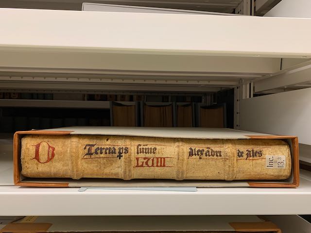 - Vorderspielgel: "Pertinet ad Torberg" und "Prima pars sume Alexandri de Ales" u.ä., nur im 4. Band fehlend