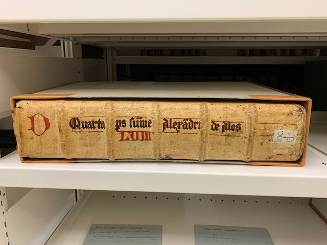 - Vorderspielgel: "Pertinet ad Torberg" und "Prima pars sume Alexandri de Ales" u.ä., nur im 4. Band fehlend
