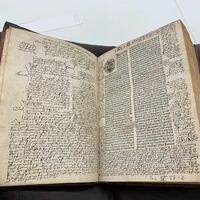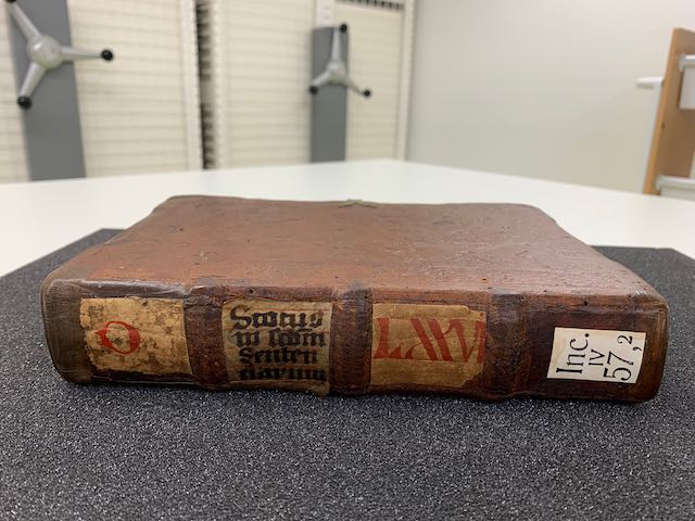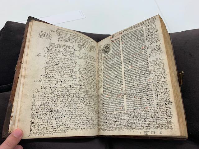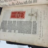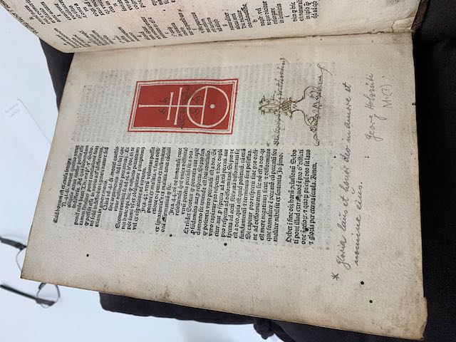 - Handschriftlicher Besitzvermerk auf vorderem Spiegel (Band 1): "Pertinet domui porte montis, a [con]fratre m[a]g[ist]ro francisco kolb donatus" (ähnlich in allen vier Bänden)In Band 2, Blatt y₉ verso, auf der Druckermarke handschriftliche Initialen G H, darunter Zeichnung mit handschriftlichem Text (stark abgekürzt, gemäss Ausschreibung in Graphit darunter): "Gloria laus et honor deo in amore et nomine eius - Georg Holzrüti"