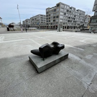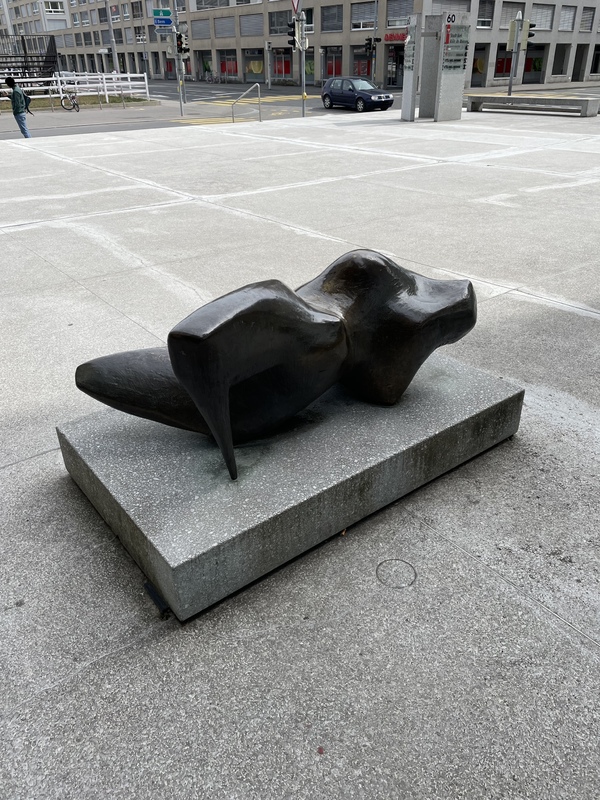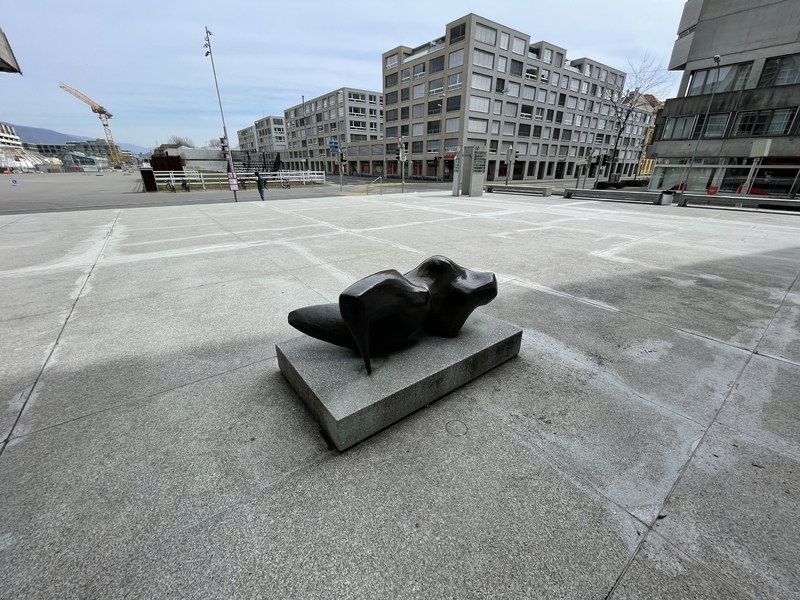 Liegend bettet sich die Bronzeplastik „Kyra“ neben dem Eingang auf dem Vorplatz des Bieler Kongresshauses. Die nahe Platzierung der Skulptur von Max Weiss an der Fensterfassade des Kongresshauses nimmt die Plastik förmlich auf.