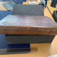 - Einband 1985 in der Franziskanerbibliothek restauriert, der alte Rücken in einer Tasche im Innern des Buches aufbewahrt.