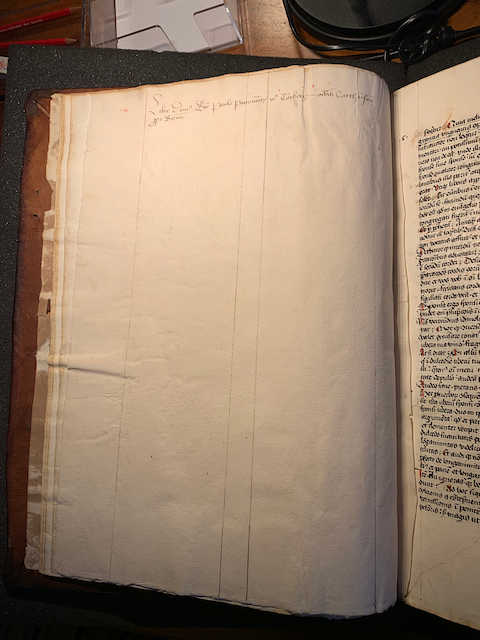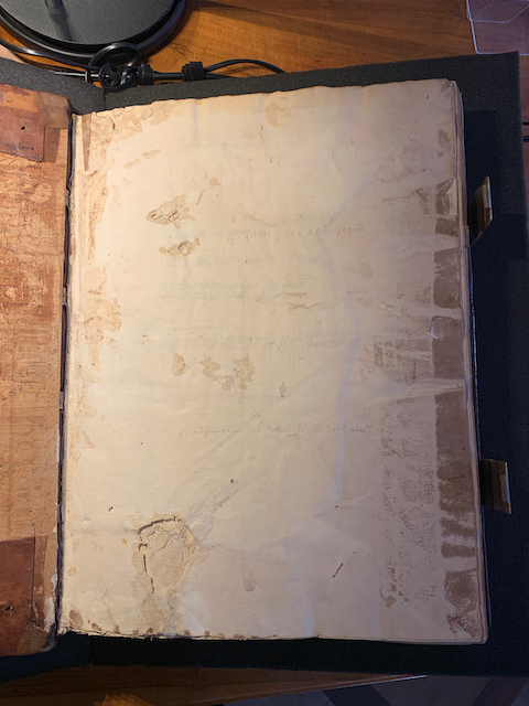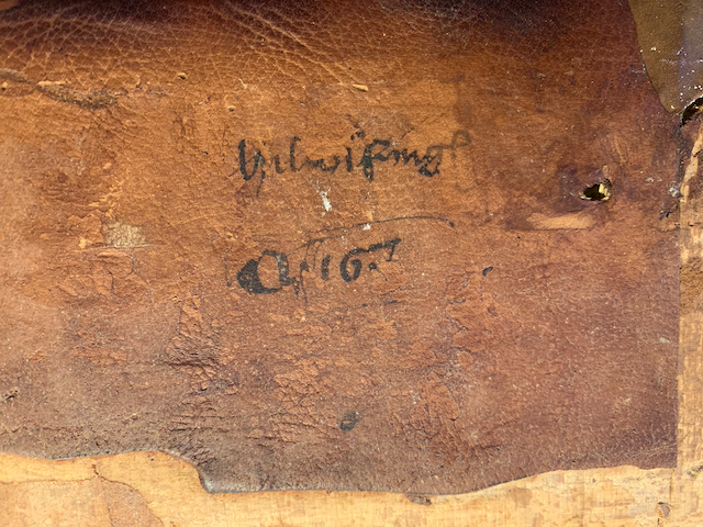 alte Signatur "C.16" spiegelverkehrt als Leimabklatsch auf dem Deckelleder im Vorderspiegel sichtbar, dazu Notiz (Namenszug des Stifters oder Buchbinders?) 'Hibart Suinger' o.ä. - vgl. Abbildung