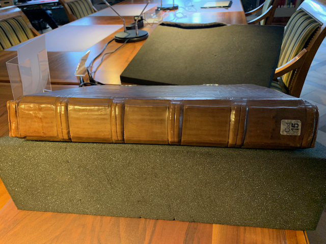 - Gotischer Originaleinband: braunes Kalbsleder auf Buchenholzdeckel (42 x 30 cm) mit geschrägten Kanten, in Kastenform mit einfachem Streicheisen blind verziert; Buchblock auf vier Wildlederbünde geheftet, hanfumstochene Kapitale; Beschläge: ursprünglich je Deckel 5 Metallbuckel, alle fehlend; am Hinterdeckel oben Loch des Kettenbeschlages; auf dem Vorderdeckel Titelnotiz 'B[eati] Bernhardi in Cantica canticorum. Gilbertus Porretanus in eadem' von Hand des 16. Jh.; Rücken und Schliessen neu, ein Rest der originalen Schliesse in der Hinterdeckel geklebt. Kein Rückentitel, unten modernes Signaturschild 'Cod. 15'. Leimabklatsche von 3 abgelösten Urkunden im vorderen und hinteren Spiegeln (diese sind aufbewahrt in BBB als Cod. 847.1): 1) aus Vorderdeckel, kopfüber: dt. Perg.-Urkunde von Petermann von Krauchtal [+1425], dat. 1392; 2) aus Hinterdeckel oben: dt. Perg.-Urkunde, Ende 14. Jh.; 3) aus Hinterdeckel unten: dt. Perg.-Urkunde, dat. 1391. Vorsatz- und Nachsatz unklar: das erste Bl. (A) und das letzte Bl. (183) möglicherweise ursprünglich in den Spiegel geklebt.