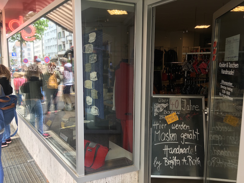 - Un magasin de couture à Berne a lancé une production artisanale de masques de protection en tissus. Ils les vendent à travers la porte entre-ouverte.