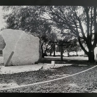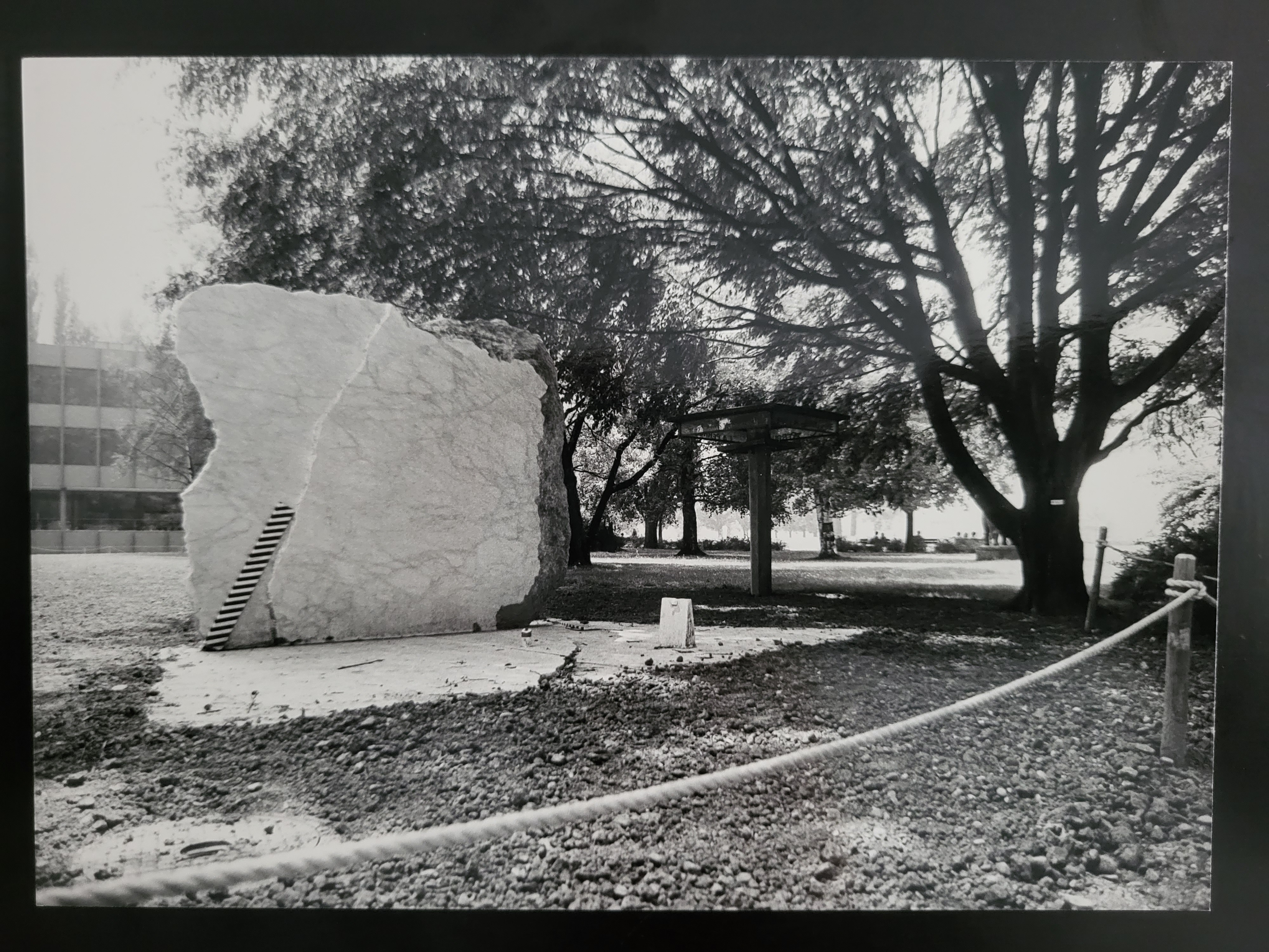 - Die Skulptur von Peter Meister wurde im Laufe der Ausstellung zerstört. Die Fotografie zeigt den Tatort unmittelbar nach der Zerstörung; es wurden mehrere Elemente entfernt .
