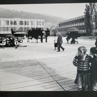- Die Fotografie zeigt das Ensemble Luginbühls auf dem Vorplatz der . Zu sehen sind (von links nach rechts) die Arbeiten "Kardinal" (1979), "Mercedes Inventura" (1978) und "Matrose Tommi" (1979).