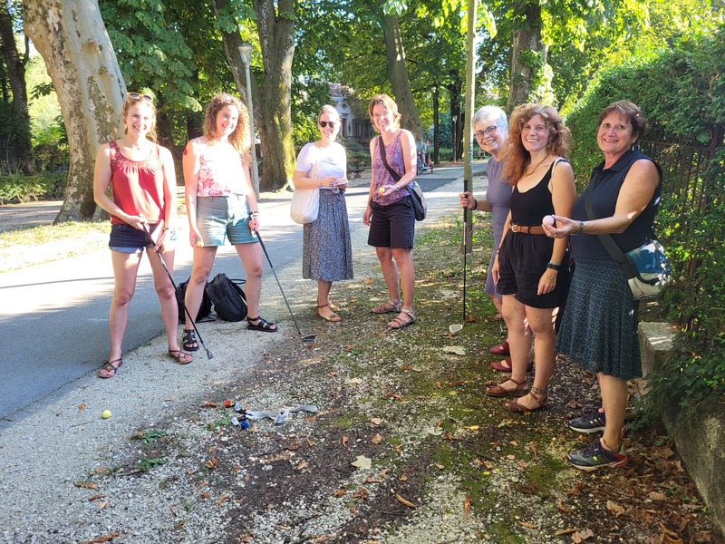 - Die Gruppe von Lehrerinnen absolvieren den Parcours Urban Golf am 8. September 2023. Dieser umfasst auch drei Skulpturen, wovon zwei ursprünglich für die SPA realisiert wurden. Die Urban Golf-Abschläge verteilen sich über den Strandboden und entlang der Schüsspromenade. Markiert sind die Abschläge mit einem auf den Boden gesprayten Graffiti. Anbieter ist Tourismus Biel Seeland.