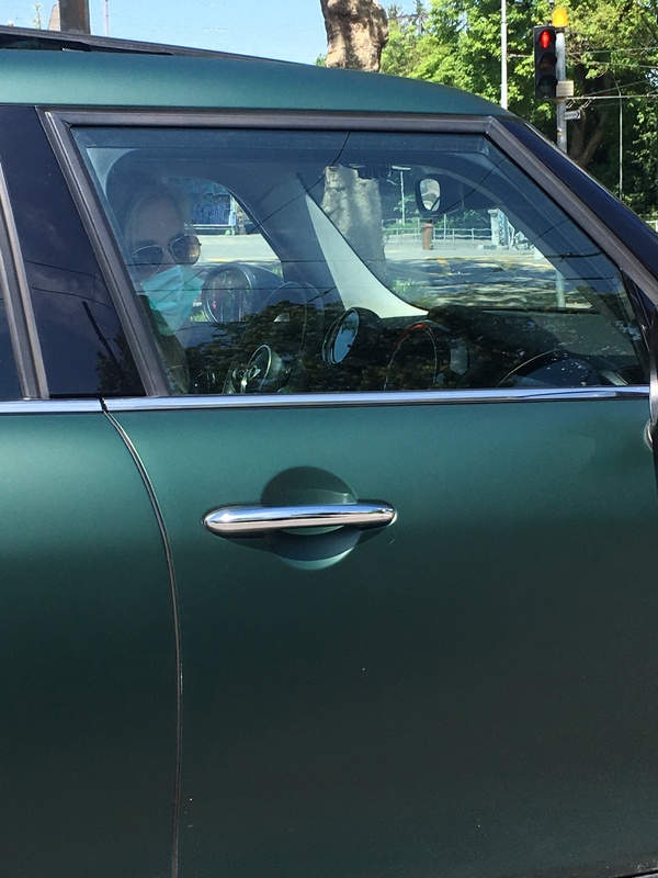 - J’ai l’impression que tout le monde se demande quand et où porter les masques de protection. Voici une personne qui a choisi de le porter en voiture. Exagéré ? Mais qui sait ? Peut-être voyage-t-elle avec une personne malade ou est-elle elle-même infectée.